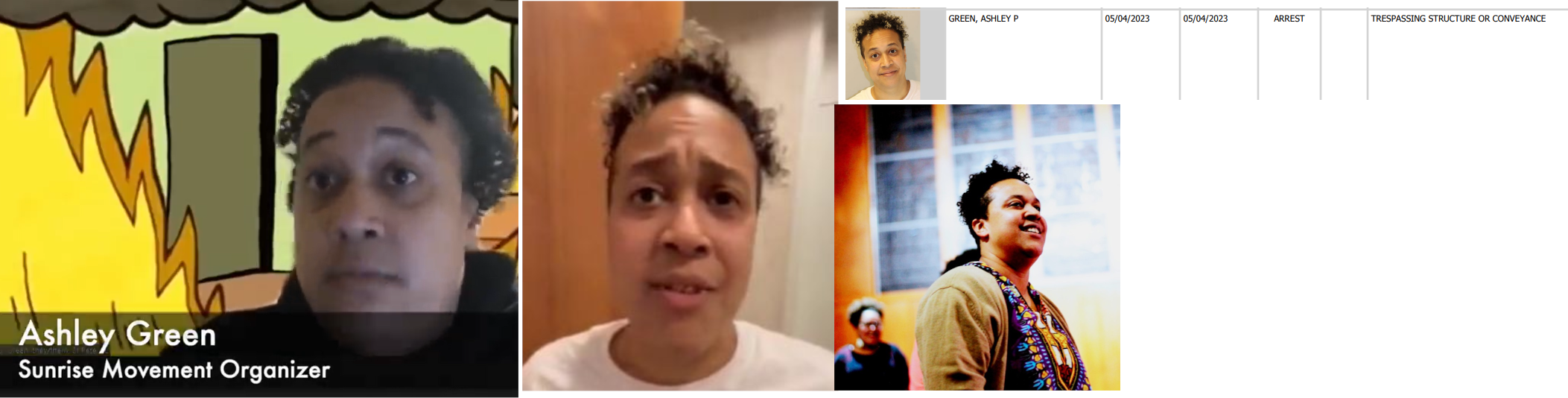 Ashley P. Green is an organizer and skills trainer for the radical environmental group Sunrise Movement. Green was arrested at a May 2023 insurrection at the Florida state capitol and charged with trespassing. Green is also an organizer for the Dream Defenders, a radical group that organized the insurrection. She worked as an SEIU labor union organizer in the mid 2010s. She's a lez and said that when Antifa rioters burned down a Minneapolis police station during a George Floyd riot, she poured shots with her girlfriend to celebrate. In 2020, she was seen on video telling a cop she hopes he gets shot. Green claims to live in St. Petersburg. https://youtu.be/DgsnyHILdb8?t=47 https://twitter.com/i/status/1654606269301358595 https://archive.ph/SfIR9 https://archive.ph/KbonR https://www.linkedin.com/in/ashley-green-112568106