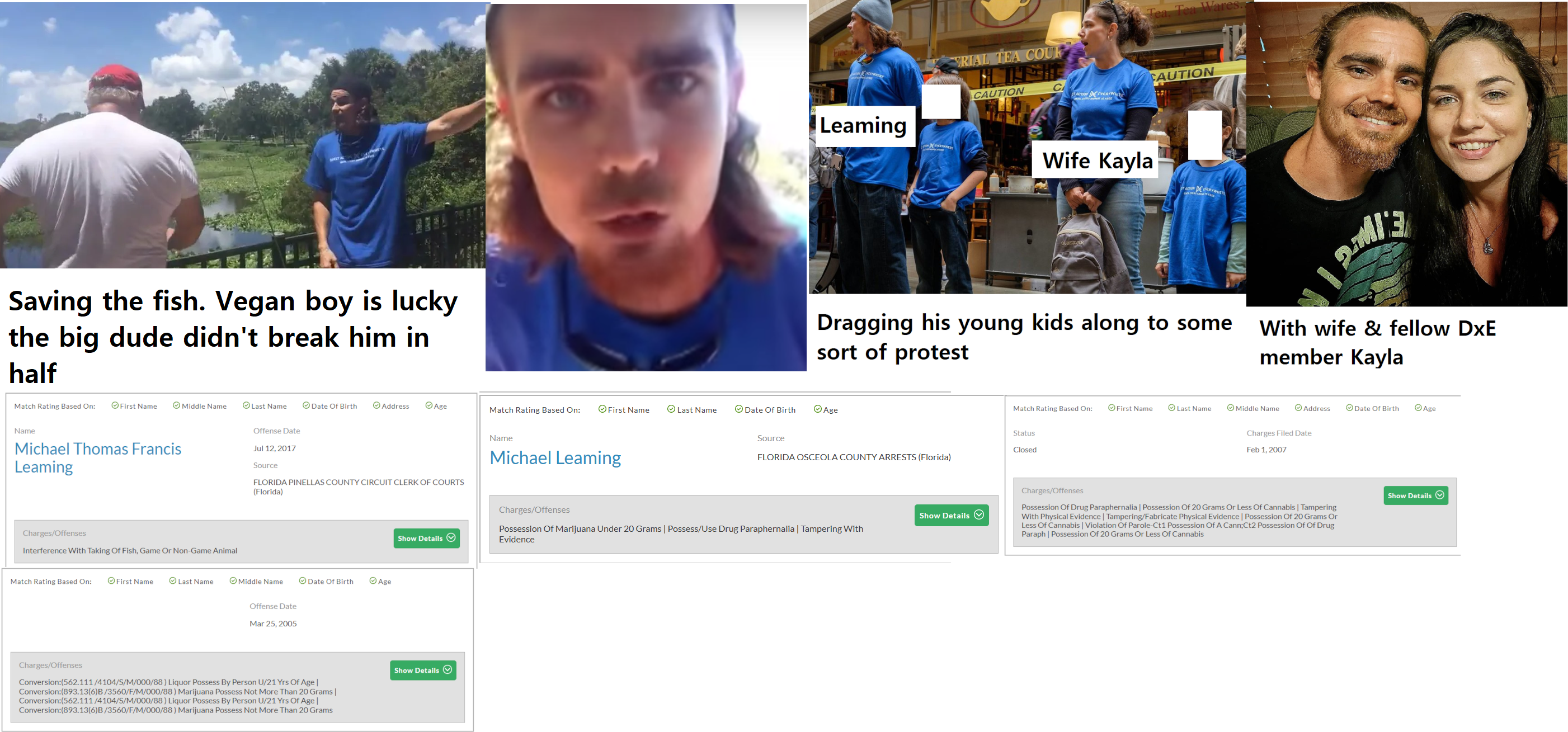 Michael "Mike" Thomas Francis Leaming (born Apr. '86) is a member a Florida chapter of the radical animal rights group Direct Action Everywhere (DxE). He was with a group of DxE members in 2017 when he famously confronted a family on a St. Petersburg fishing pier who had just caught a tilapia. He yelled at the father and said, "Did you know fish feel pain? What if it was a dog or human child?" He then grabbed the fish and threw it back into the water and shouted, "Call the police! I just saved a fish's life! How about that?". He was charged with interference with the taking of a fish. Leaming was also allegedly at a disruption of Cow Appreciation Day at a local Chik fil A restaurant at which some DxE members carried carving knives. He has numerous priors including charges for possession of drug paraphernalia, possession of cannabis, parole violation, petit theft and tampering with evidence. His wife, Kayla, is also a DxE member and the couple have taken their young children to at least one DxE "action". The family lives in a crappy house in St. Cloud, an Orlando suburb. https://archive.ph/SntWV https://archive.ph/Z8JO0 https://archive.ph/x5AQO https://youtu.be/QLDxGQI2NgQ (Vid of incident)
