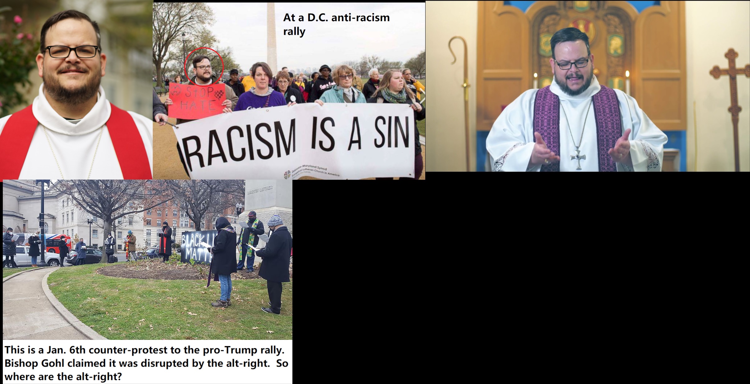 William "Bill" Jenkins Gohl (DOB: 03/25/74) is a Lutheran bishop who participated in the Charlottesville Unite the Right counter-protest. He also gathered with other "faith leaders" to protest the Jan 6th protests and got his holy knickers up in a knot when Trump supporters took exception to his counter-protest. He said, “This holy ground was desecrated by those who mocked our purpose and prayer, including a man dressed in a faux animal skin vest" (Probably QAnon Shaman ha ha). Strangely, neither the diocese's blog post nor a YT video of the event showed any sort of disruption by the alt-right. Gohl lives with his wife and four kids in a small house in the Cedmont neighborhood in Baltimore. https://archive.ph/6W1UK#selection-1013.288-1013.383