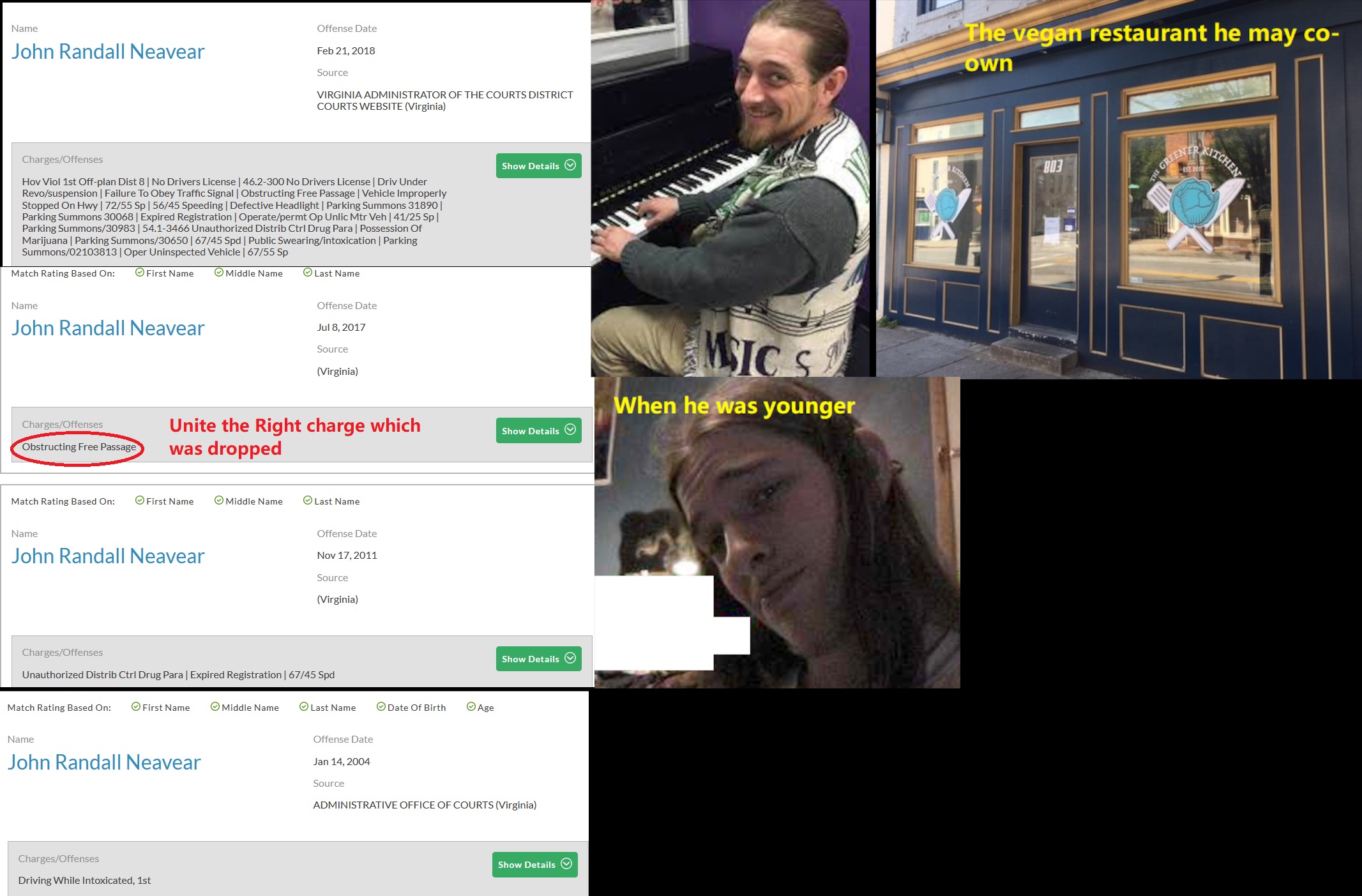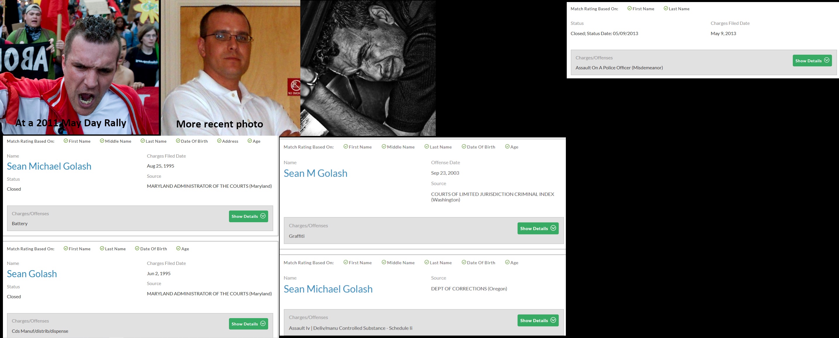 Sean Michael Golash (DOB: 09/07/76) was allegedly one of the organizers of the Charlottesville counter protest. Golash was previously photographed at a 2011 May Day protest in DC and may have been active in the Occupy movement. He has a long rap sheet with arrests for assault, assault on a police officer, battery, manufacture/delivery of a controlled substance, graffiti and destruction of property. Golash currently (2022) works as a computer repairman for Amazon Web Services. He lives in a small bungalow in the D.C. suburb of Silver Spring, Maryland. https://archive.ph/8buIN#selection-4161.6-4161.17