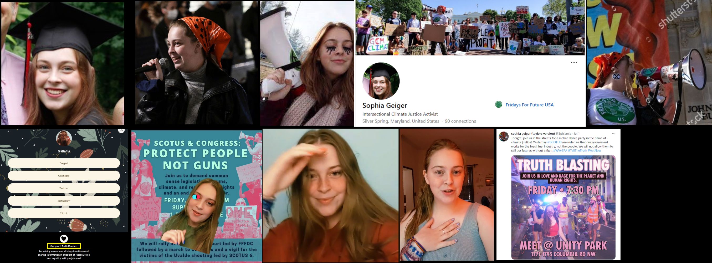 She's a radical and member of Shutdown DC who describes herself as a "Intersectional Climate Justice Activist". She's also an organizer for Fridays For Future DC, a youth environmentalist group. Her political interests seem to revolve around "climate change" and abortion. Geiger wants Biden to declare a climate emergency. She was one of the participants in an illegal demonstration in front of SCOTUS justice Brett Kavanaugh's home in late 2021 and was interviewed. Geiger also participated in Shutdown DC's December 2021 protest to literally shutdown the Capitol's streets in order to protest for various left-wing causes. Geiger's TikTok feed is filled with numerous left-wing videos and she seems to be having a blast making them. She lives in the DC suburb of Silver Spring, probably with her parents. https://archive.ph/Q2ZRa#selection-1241.146-1241.159 (SCOTUS Protest) https://archive.ph/9fdn2#selection-971.311-971.324 (Shut Down DC Protest) https://archive.ph/BYpOw#selection-1611.0-1611.13 https://archive.ph/f2K6R#selection-681.2-681.15 https://www.linkedin.com/in/sophia-geiger-67ba07212 https://linktr.ee/s0ph1a