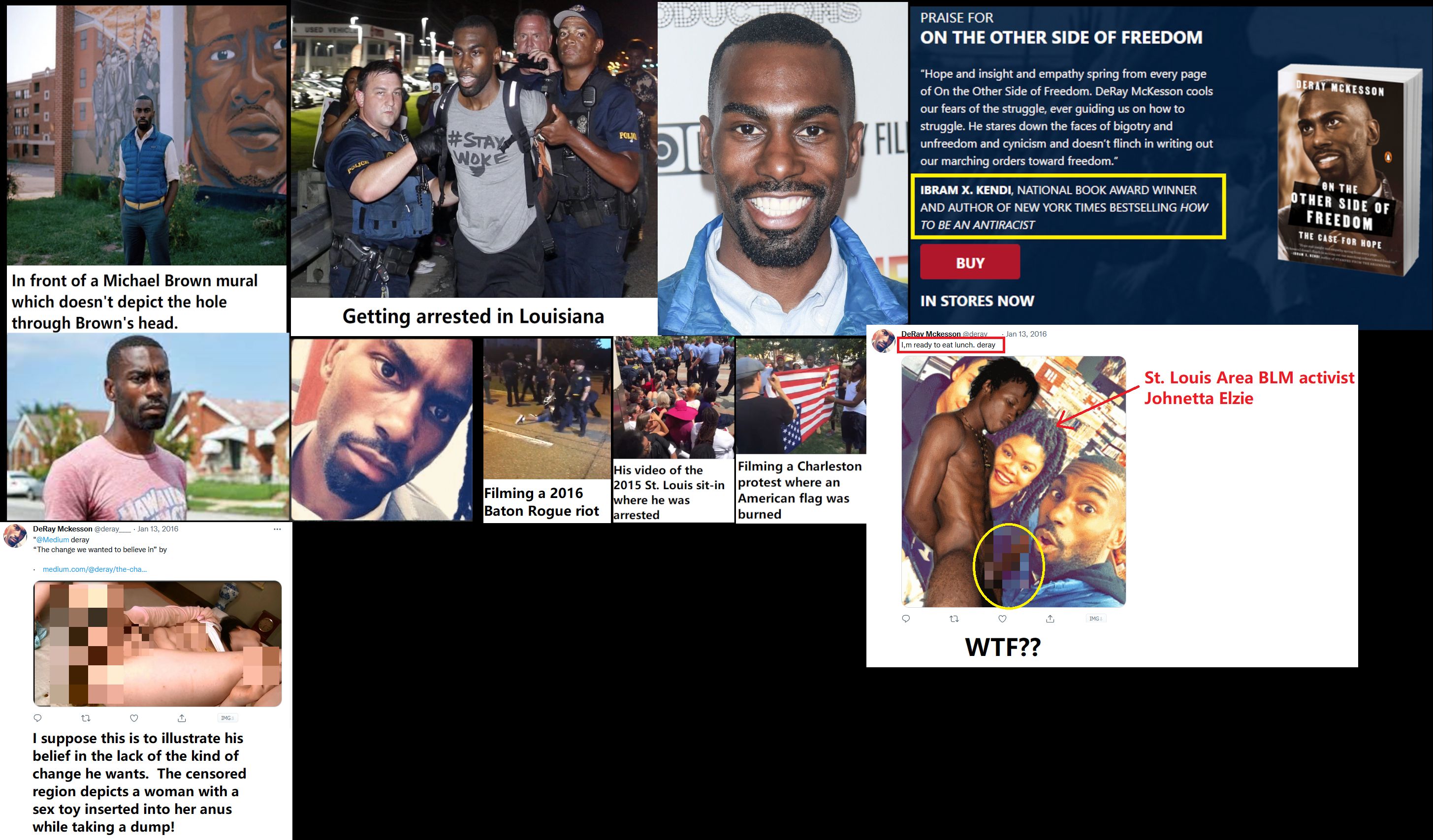DeRay M. McKesson (DOB: 07/09/85) is a Baltimore BLM activist who attended and videoed many of the St. Louis area riots in 2014 and may have live-streamed the events. He was arrested in 2015 at a sit-in at the Federal courthouse in St. Louis. McKesson was arrested again in 2016 at a largely peaceful riot held in memory of the death of some dude in Baton Rouge. He also attended a BLM protest in Wharton Texas in the middle of effing nowhere. While in Wharton, he toured a famous plantation, perhaps he has family ties? None of his criminal charges seem to have stuck as his only criminal record is for traffic violations. McKesson formerly worked as a school administrator before realizing there was more money in working as a full-time activist. He wrote a book titled, "On the Other Side of Freedom" which he convinced CRT theorist Ibram X. Kendi to shill. McKesson has a degree in government from prestigious Bowdoin College in Maine (he was reportedly the only black guy in Maine at the time:) ). He's probably gay as he Tweeted a photo-shopped picture of a young black guy with his penis near McKesson's mouth the the caption "I'm ready to eat lunch". In the photo, fellow BLM radical Johnetta Elize looked on with a smile on her face (see attached censored photo). He Tweeted an equally disgusting Tweet of a woman taking a dump while a sex toy was inserted in her anus! He lives with his gay homies in Baltimore's gayborhood of Mt. Vernon. https://archive.ph/4N8vs, https://deray.com/, https://archive.ph/WxNhl (His videos of riots he attended)