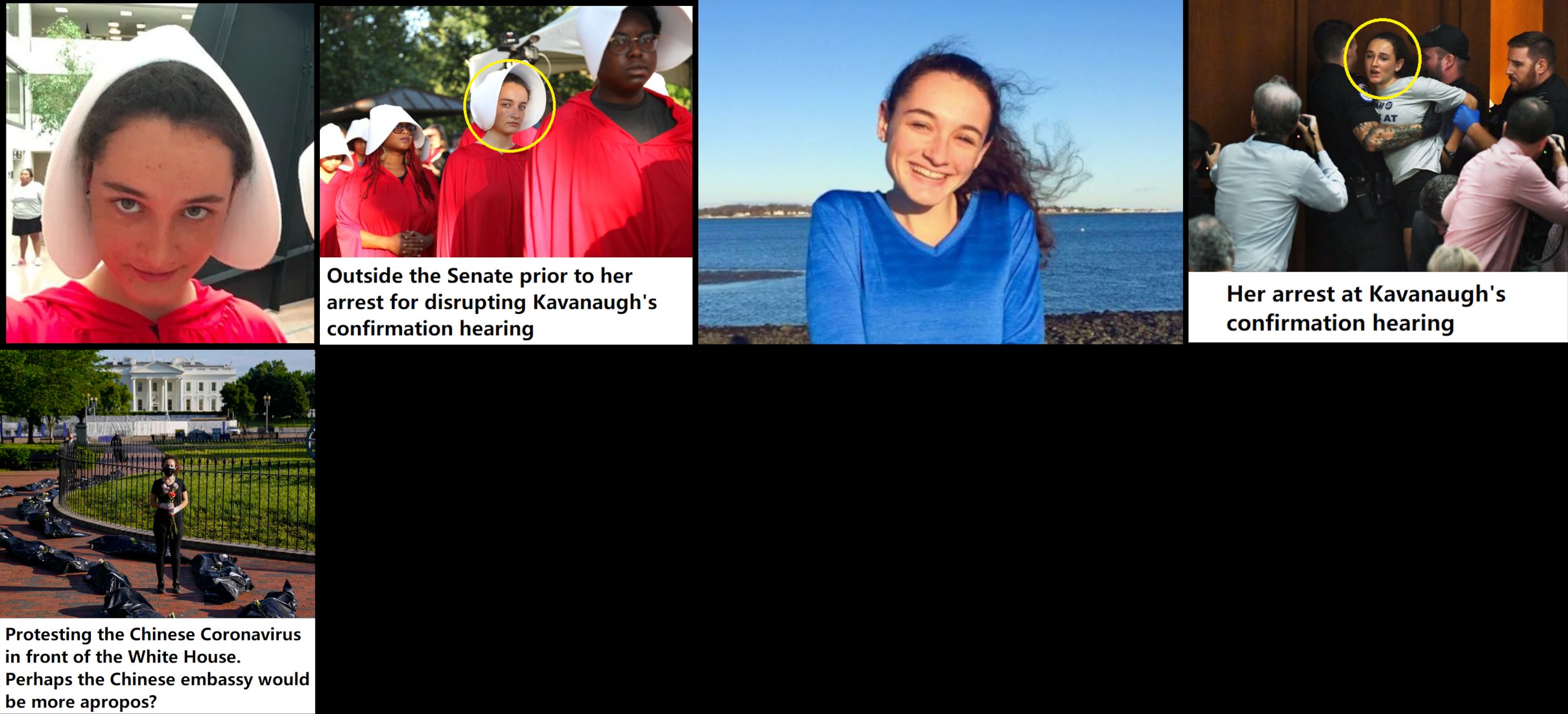 She's the daughter of infamous radical organizer Nadine Bloch and is a radical force to be reckoned with in her own right. The poor kid probably never had a chance for a normal life. Her mother dragged her to an anti-war protest in Tampa when she was only two. As a teen she attended a Resisting Trump Action Camp in DC. In 2018, Margot dressed as a hand maid and was arrested for disrupting Brett Kavanaugh's confirmation hearing. In 2020 she protested against Trump's handling of the Chinese Coronavirus in front of the White House although the Chinese embassy would probably have been a more appropriate location. As of the late 2000s, she was a student at the University of Maryland majoring in government. She lives in Takoma Park, Maryland. https://archive.ph/3oPk4 https://archive.ph/o0zIv#selection-1635.98-1635.110 https://archive.ph/d48Hr#selection-421.0-421.12