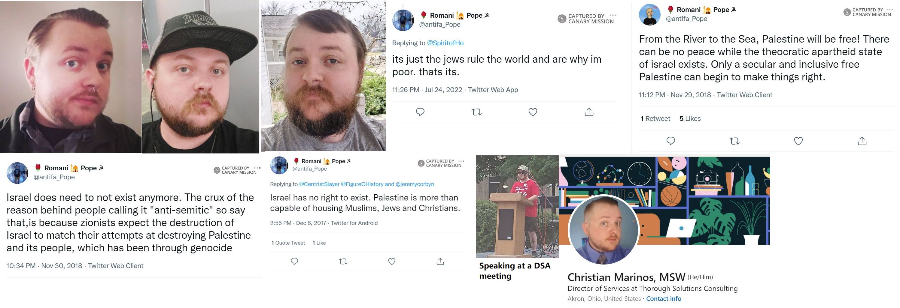 Christian Peter Marinos (DOB: 04/26/96) is a social worker on the staff of the Midwestern Marx publishing house. He was chapter president of the Akron University Democratic Socialists of America. Marinos Twitter account is "Antifa_Pope". According to the Canary Mission website, he's also an anti-Semite who Tweeted a lot of anti-Israel and anti-Jewish garbage before he locked down his account. He lives with his mommy and daddy in their house in Akron. Ma & Pa fly an American flag in front of their house. https://web.archive.org/web/20221001154525/https://www.midwesternmarx.com/staff.html https://archive.ph/PZN27 https://www.linkedin.com/in/christianmarinos https://www.twitch.tv/el_pope