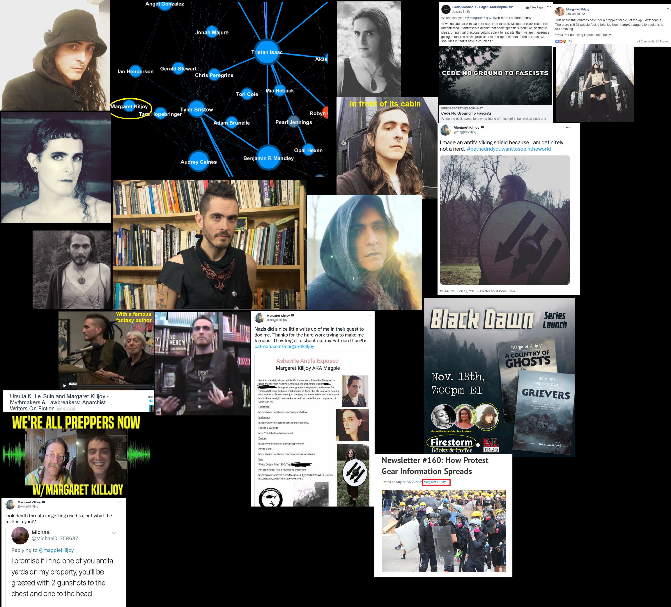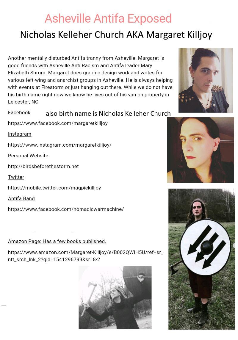 Original report under his real name, Nicholas Church - https://antifawatch.net/ViewReport/10abba30 Leaving this one up as it has a bit of different info and helpful to have both names. Margaret Killjoy, AKA "Magpie", is a tranny author and musician that used to live in Portland. It was and still may be connected to the Tristan Romine-Mann (Tristan Isaac) wing of Portland Antifa. It writes mostly in the queer anarchist steampunk (?!?) and folk horror genres. It was involved in "forest defense" in Oregon as part of the "Green Scare" wave of domestic terrorism. The Antifa doxxing group the Albanian Armed Forces lists Killjoy as a member of Asheville Anti-Racism. Killjoy came out as "genderqueer" in 2015. It formed a black metal band in 2018 known as Feminazgul who's theme appears to be hatred of non-trans men. It seems to be into survivalism as well as medieval weapons; Killjoy accidentally shot itself in the knee with an arrow. It moved to the Appalachian Mountains and built a cabin in the late 2010s as part of an Anarchist land project (probably a squatter camp). Killjoy is believed to live in the North Carolina mountains, probably in the Asheville area. Note that its surname may sometimes be spelled "Kiljoy". https://en.wikipedia.org/wiki/Margaret_Killjoy https://archive.vn/Ci5Zi, https://archive.vn/3ycmk, https://archive.vn/9cmJV https://en.wikipedia.org/wiki/Feminazg%C3%BBl http://www.feminazgul.com/ https://vimeo.com/9010456 https://birdsbeforethestorm.net/ Mr anarchist wrote a piece for the Business Insider!? So he has doxxed multiple people with his group Asheville Anti Racism and is now complaining thru a capitalist publication https://www.businessinsider.com/author/margaret-killjoy?op=1