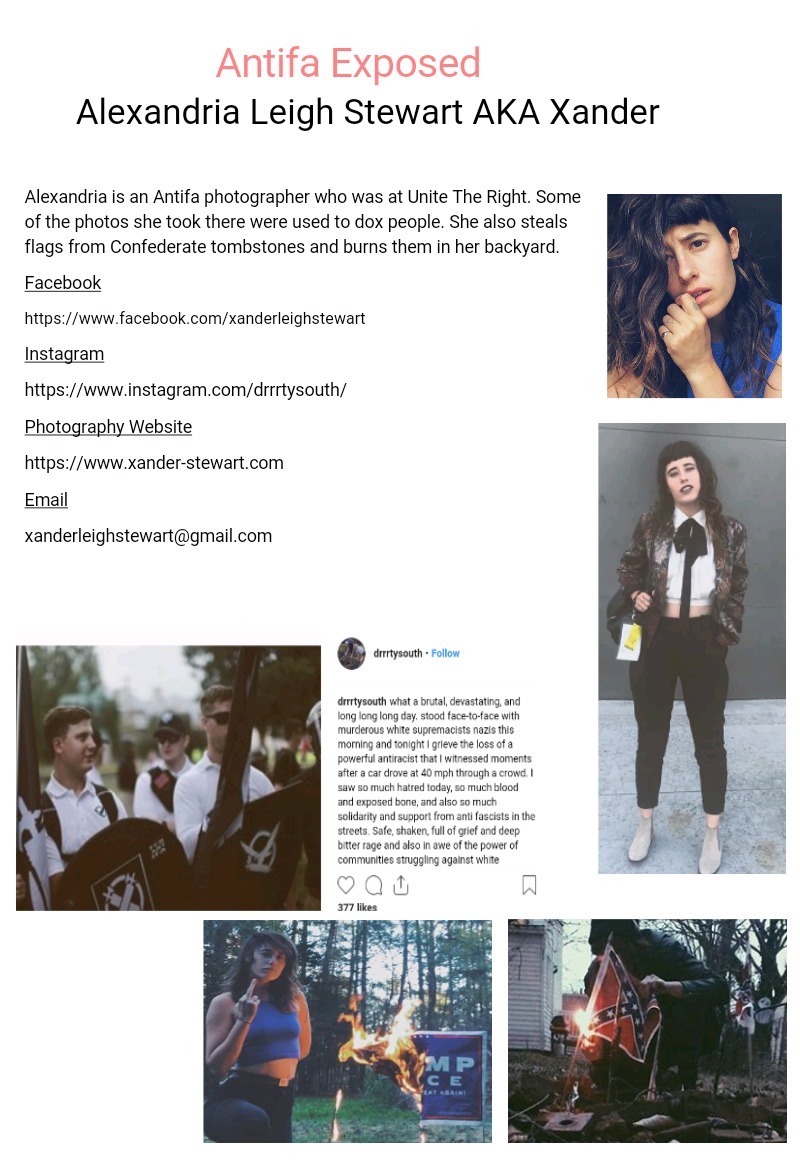https://abc11.com/durham-police-department-vandalism-arrests-dpd-hq-protest/6324571/ https://durhamnc.gov/CivicAlerts.aspx?AID=2508 Alexandria Stewart, 28, of Durham - failure to disperse on command and felony inciting to riot Lives in Durham but active with Asheville AntiRacism Thinks changing her name to Xander will keep her hidden. Nope https://xanderstewart.format.com https://realitysandwich.com/flame-dirt-rust-silk-an-interview-with-filmmaker-xander-stewart/