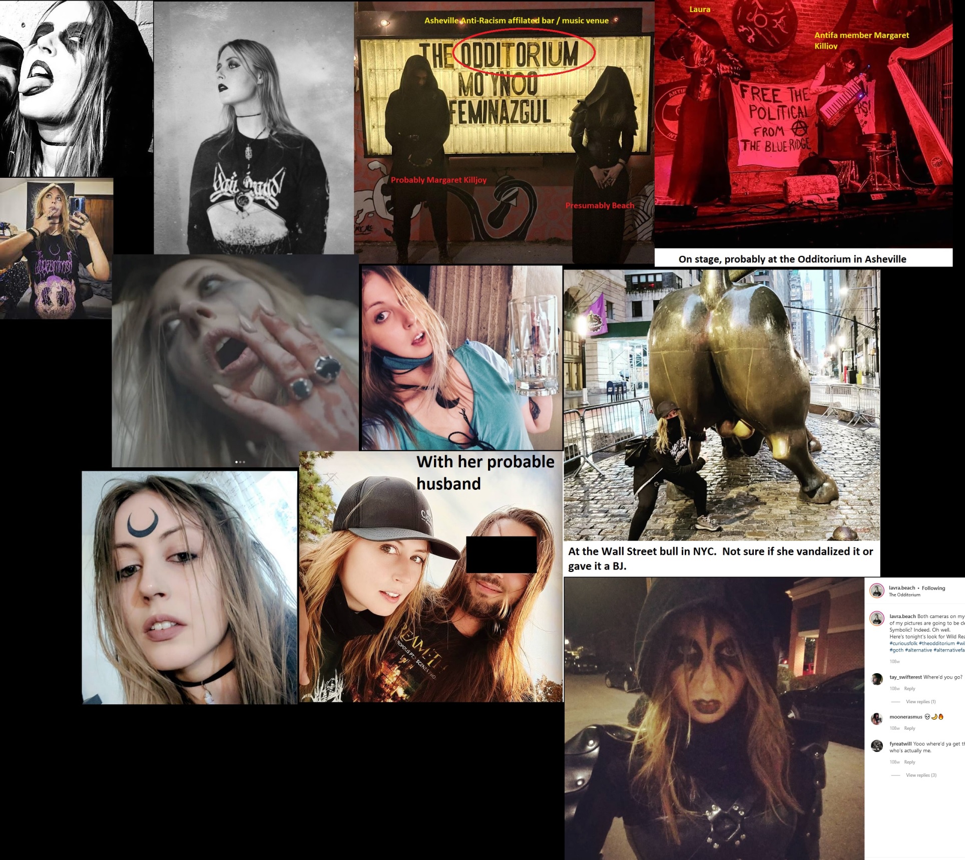 Laura E. Beach (DOB: 03/03/89) is the lead singer in the antifascist band Feminazgul which was formed by transgendered Antifa member Margaret Killjoy. Beach claimed in an interview to have always been hard left. Beach appears to be the band's sex symbol for straights while Margaret is the sex object for queers/trannies. She's appeared in at least one music video produced by another band. She's probably married and works in her husband's business. Note that there's a Methodist minister with the same name in the Asheville area who obviously isn't Antifa. Coincidentally, the minister is about the same age and looks a lot like the Antifa singer. https://en.wikipedia.org/wiki/Feminazg%C3%BBl https://archive.vn/KFXuQ, https://archive.vn/3C1Yl, https://archive.vn/AtG3g
