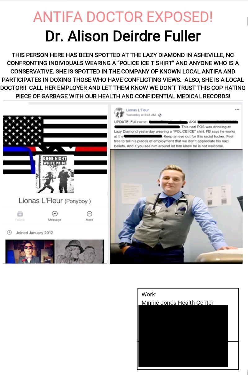 A core member of Asheville Torch Antifa. She was spotted taking photos that were used in a dox of local patriots. She also doxed and harassed a fine young gentlemen who was having a drink at her favorite bar The Lazy Diamond. She is an actual Dr. but calls for violence against her political opponents. Also thinks all cops are Nazis, so edgy! aka Ponyboy https://doctor.webmd.com/doctor/alison-fuller-8c000c93-3a89-4b09-988d-cbedb9606fc7-overview https://www.healthgrades.com/physician/dr-alison-fuller-y9s48wz https://www.citizen-times.com/story/news/local/2016/08/12/once-patient-now-doctor-fuller-joins-health-clinic/88180224/ DOB: 05/02/79. Fuller is a family medicine physician. She was convicted of writing a worthless check in 1999. She has a few other brushes with the law for unknown offenses. https://archive.vn/zTWjK