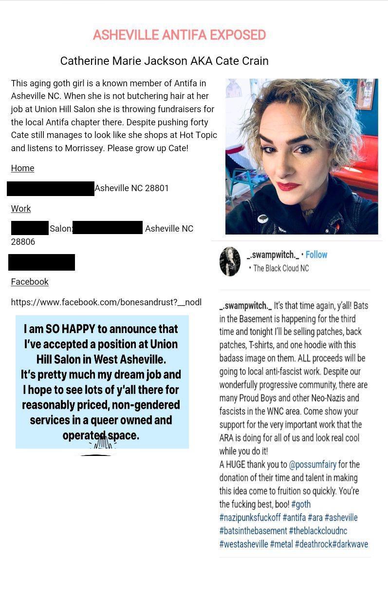 Catherine Marie Jackson (DOB: 10/31/80) is allegedly a witch and a core member of Asheville's Antifa squad. She's a hair stylist by trade. Jackson doesn't appear to have any protest related arrests but she was busted for larceny in the early 2000s. https://theswissbay.ch/pdf/_notpdf_/AAF%20Albanian%20Armed%20Forces/A%20ROSE%20BY%20ANY%20OTHER%20NAME/Asheville%20NC%20An%20tifa%20Network%20Map/0%20-%20MASTER%20FILES%20-%20START%20HERE/Asheville%20NC%20Auntie%20Fa%20-%20Master%20file%20part%201.pdf updated info for her https://truststudioavl.glossgenius.com http://facebook.com/trustavl https://www.instagram.com/truststudioavl Looks like she calls herself Crain Jackson now since she was last exposed. She held a fundraiser for Asheville Anti Racism at a bar where see worked a few years ago. She also got a new tattoo of huge alligator on her arm as well. Was dating a doctor associated with AAR named Alison Fuller but have since broken up. Now now works at Neon Moon Salon on Haywood Rd in West Asheville