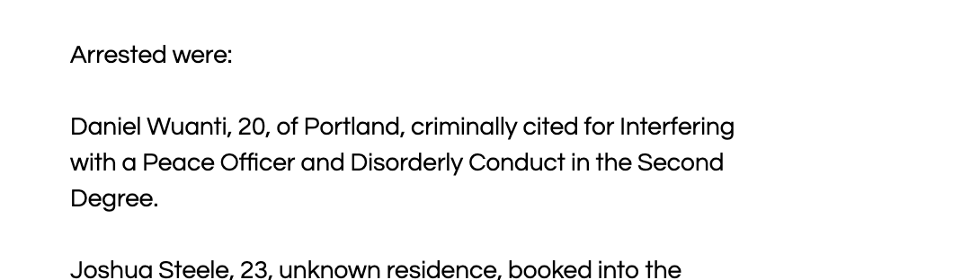 https://www.portlandoregon.gov/police/news/read.cfm?id=271441 Daniel Wuanti, 20, of Portland, criminally cited for Interfering with a Peace Officer and Disorderly Conduct in the Second Degree.