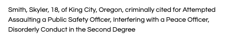 https://www.portlandoregon.gov/police/news/read.cfm?id=261123 Smith, Skyler, 18, of King City, Oregon, criminally cited for Attempted Assaulting a Public Safety Officer, Interfering with a Peace Officer, Disorderly Conduct in the Second Degree
