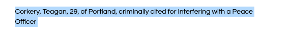 https://www.portlandoregon.gov/police/news/read.cfm?id=261123 Corkery, Teagan, 29, of Portland, criminally cited for Interfering with a Peace Officer