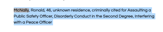 https://www.portlandoregon.gov/police/news/read.cfm?id=261123 McNally, Ronald, 46, unknown residence, criminally cited for Assaulting a Public Safety Officer, Disorderly Conduct in the Second Degree, Interfering with a Peace Officer