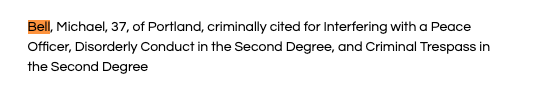 https://www.portlandoregon.gov/police/news/read.cfm?id=261123 Bell, Michael, 37, of Portland, criminally cited for Interfering with a Peace Officer, Disorderly Conduct in the Second Degree, and Criminal Trespass in the Second Degree