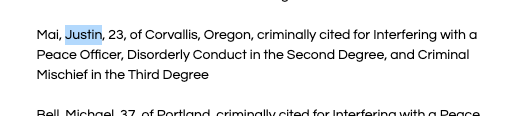 https://www.portlandoregon.gov/police/news/read.cfm?id=261123 Mai, Justin, 23, of Corvallis, Oregon, criminally cited for Interfering with a Peace Officer, Disorderly Conduct in the Second Degree, and Criminal Mischief in the Third Degree