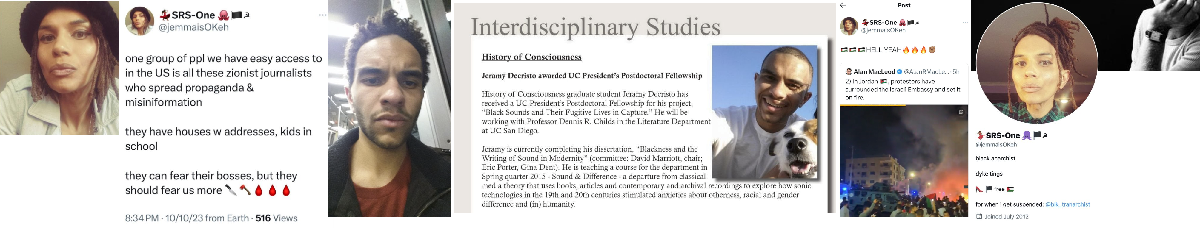 Jemma Marcus DeCristo, aka Jeramy DeCristo, (born May '86) is a self-described black lesbian tranarchist and UC-Davis professor who Tweeted threats against "Zionist" journalists and their children. The Tweet emojis included a knife, axe and blood. DeCristo came under heavy fire after its Tweet was publicized and it locked its Twitter account. UC-Davis issued a weak disavowal of DeCristo's statements but did not immediately fire it. It lives in an apartment in San Francisco's Mission District. https://archive.ph/hxmBM
