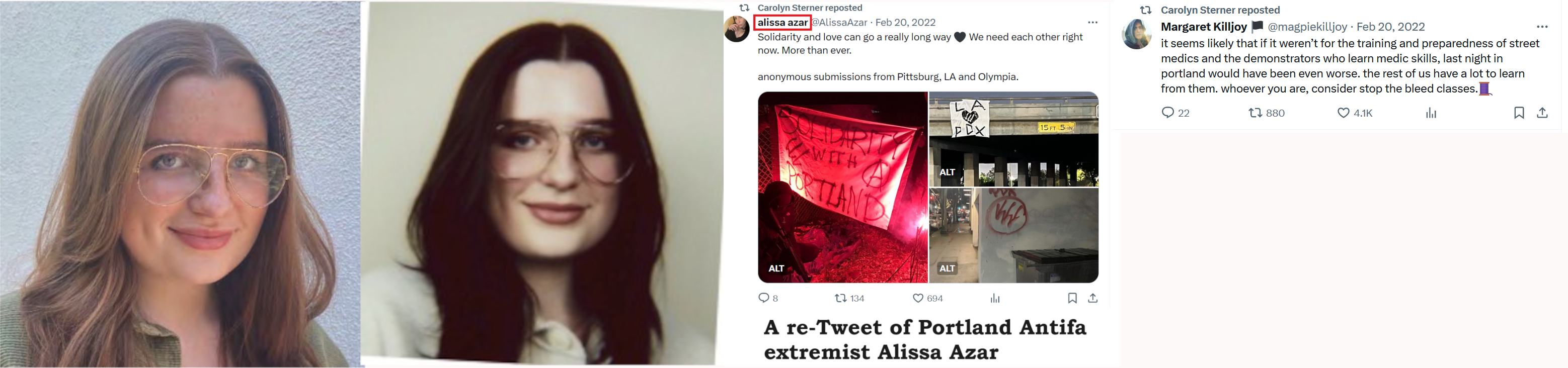 Carolyn J. Sterner (Born May '99) was a student at New York University who left to live with her sister in Seattle during the pandemic. She participated in several June 2020 riots in Seattle and also a July riot. She was prepared for action at the July riot, wearing a helmet and carrying the standard Antifa umbrella. She advanced to the front of the mob and used an umbrella to attempt to shield herself and fellow rioters. Numerous flash bang grenades exploded around Sterner and she claims to have suffered significant hearing loss. She later sued the city. Sterner re-Tweets a lot of left wing garbage such as Tweets from notorious Portland Antifa Alisa Azar (https://antifawatch.net/ViewReport/5f23c1a8) and tranny Ashville Antifa Margaret Killjoy (https://antifawatch.net/ViewReport/1a45c437). She moved to Cali and works as an art director at Las Palmas Arts in Palm Springs. She lives in a $1.3 mil. mansion in Palm Springs, presumably with relatives or a sugar daddy. https://web.archive.org/web/20231213144131/https://southseattleemerald.com/wp-content/uploads/2021/08/Third-Amended-Complaint-Draft-030221-Clean.pdf (pp. 191-193)