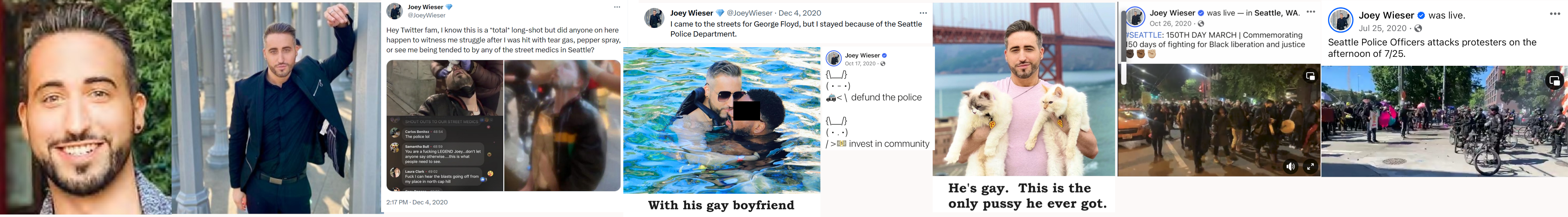 Joseph "Joey" Wieser is a serial rioter who participated in three June 2020 riots in the Capitol Hill neighborhood of Seattle. He was at the front of the mob at one of the riots. He later participated in a July 2020 riot that was held to protest the dismantling of CHAZ/CHOP. Wieser was also at two other July riots and an October 2020 riot. He livestreamed footage from the riots and posted it on Facebook. Even though he was never seriously injured, Mr. Wieser sued the city. He works as a YouTube channel manager and now lives in Los Angeles. He's gay and has a black boyfriend to show that Black Lives Matter. Unsurprisingly, he's a police defunder. https://web.archive.org/web/20231213144131/https://southseattleemerald.com/wp-content/uploads/2021/08/Third-Amended-Complaint-Draft-030221-Clean.pdf (pp. 207-211) https://www.linkedin.com/in/joeywieser