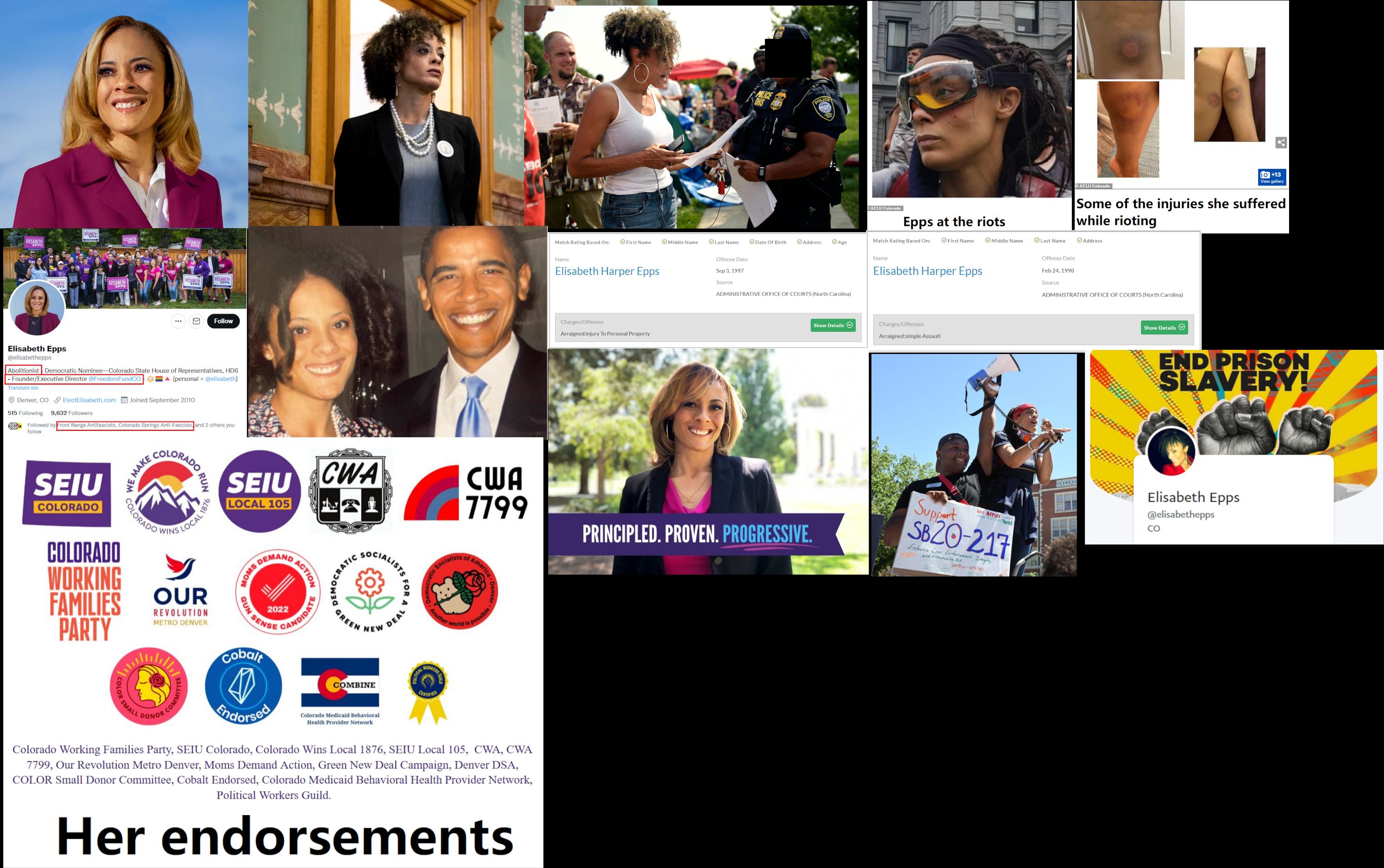 Elisabeth Harper Epps (DOB: 10/08/79) is a Democratic Colorado State Representative who participated in the violent George Floyd rioting in Denver in 2020. She claimed to have been gassed and shot multiple times. She later filed an excessive force lawsuit against the Denver PD with the help of the ACLU. Epps describes herself as an "abolitionist", presumably meaning abolition of the police and she claims migration is a human right. Her political campaign was endorsed by many labor unions including the radical SEIU and was also endorsed by the Democratic Socialists. She was arrested on an assault charge and a vandalism charge in the late '90s but does not appear to have been arrested at recent riots. Epps was a teen mother who nevertheless managed to earn a JD from the University of Virginia. She worked as a public defender in Denver for a while. She claims to have founded the Colorado Freedom Fund, a group that bails rioters out of jail and she works as the group's executive director. In recognition of her service for bailing out criminals she was awarded the University of Virginia School of Law's award for public service. Epps lives in an apartment in the Denver suburb of Englewood. https://archive.ph/NEzcC#selection-625.0-625.14 https://archive.ph/RuIHW, https://archive.ph/nVd5P https://www.elisabethepps.com/ https://www.coloradofreedomfund.org/
