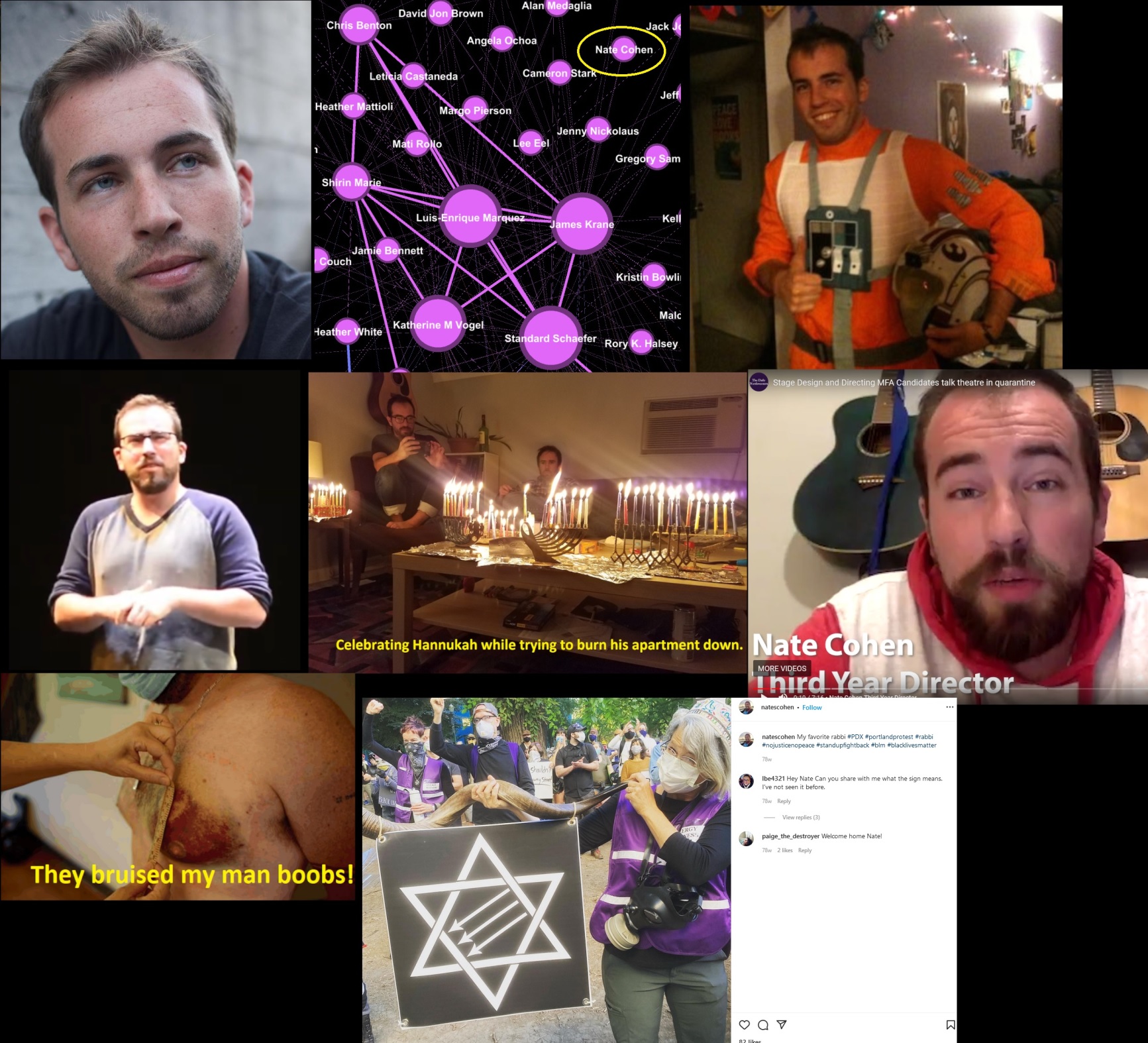 Nathan "Nate" Solomon Cohen (DOB: 01/23/90) has social media ties to the Marquez gang in Portland Antifa. He's been an activist with organizations such as the ACLU, Don’t Shoot Portland, and PDX Never Again. He moved to Chicago to pursue an MFA in directing from Northwestern University and he's best known for directing a Winnie the Pooh play. Even though he lives in Chicago, he came back to Portland to participate in the 2020 riots, supposedly as a street medic. He was hit in the chest with a tear gas canister and later sued the Feds. https://archive.vn/4iZU2, https://archive.vn/oowJt, https://archive.vn/QGRPP https://www.youtube.com/watch?v=OHfm07V3eEU&ab_channel=Don%27tShootPortland https://www.youtube.com/watch?v=8Xj8x3XKFPo&t=19s&ab_channel=DailyNUVideo https://s3.documentcloud.org/documents/20619440/cohen_v_russel_et_al_21cv00579_4192021.pdf