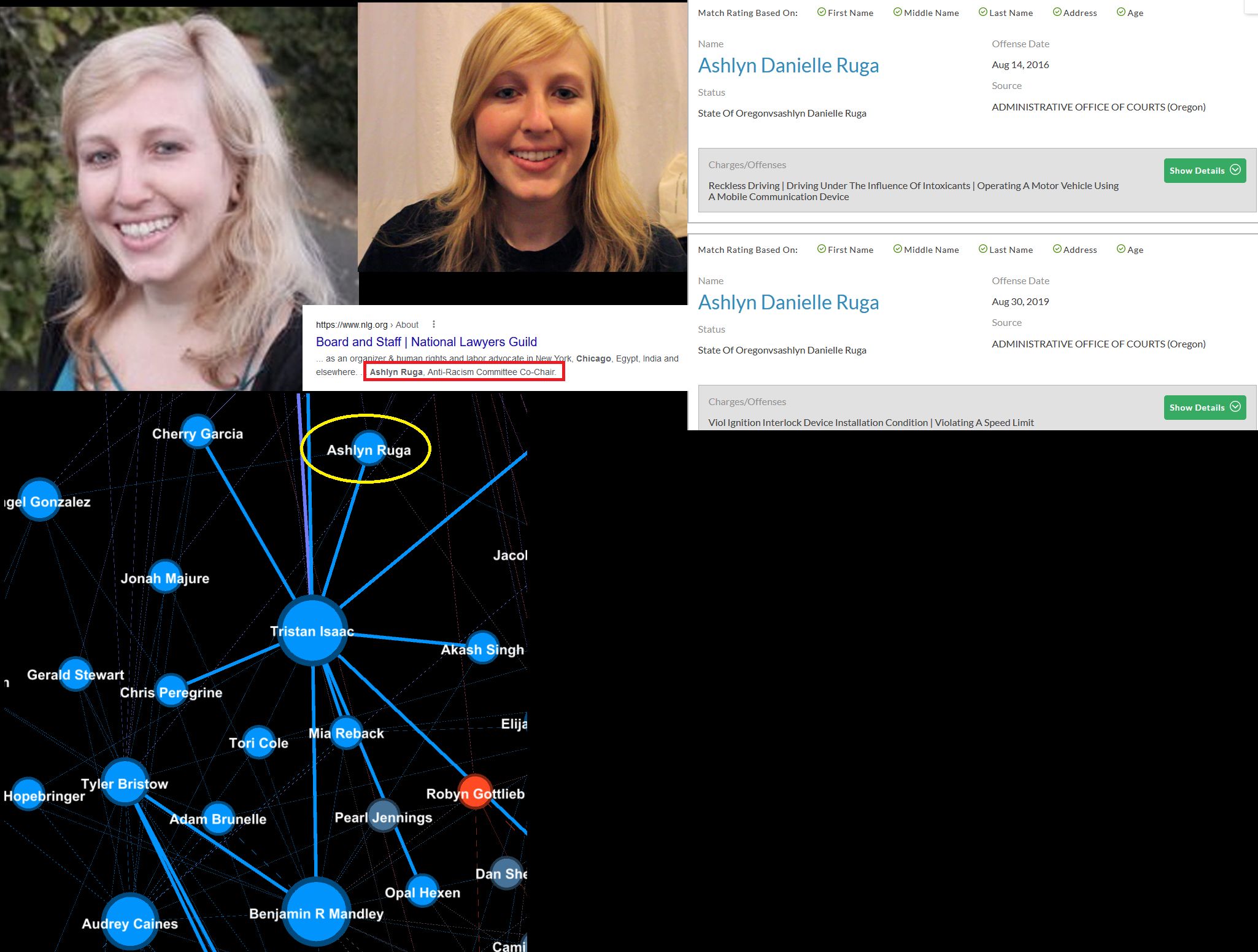 Ashlyn Danielle Ruga (DOB: 03/21/91) is allegedly connected on social media to the Tristan Romine-Mann (Tristan Isaac) gang within Rose City Antifa. She's an attorney and probably isn't a hard-core on the ground Antifa member. She does, however, openly support Antifa. Ruga was on the Portland National Lawyer's Guild board for a time and served as the Anti-Racism co-chair. While earning her law degree, she was an extern for the Civil Liberties Defense Center. Ruga was also the defense attorney in at least one prominent Antifa trial. She moved to Illinois in 2019 to work for the Chicago Community Bond Fund. She's wrote an article on the National Lawyer's Guild website where she said, "Portland, OR has seen a massive influx of resistance to the overt and undeniable fascism and white supremacy that President Trump has re-legitimized since the 2016 election." Referring to Trump as an enabler of fascism and white supremacy is Antifa double-speak. In the same article, she complained about Portland police transporting Patriot Prayer members back to their cars. She also discussed how the NLG was supporting Occupy ICE protesters. Ruga is hell on wheels. She has numerous traffic citations and she has an Oregon DUI arrest and a probable conviction as she was later charged with violating an ignition interlock device installation condition. Ruga has a B.A. in philosophy and international studies from the University of San Francisco and a JD from Lewis & Clark. While everyone, including Antifa members, has a right to a criminal defense attorney, in my opinion Ruga is probably more than just a run-of-the-mill defender of radicals. https://archive.vn/97h8u, https://archive.vn/FznJ1 https://archive.vn/ctzK8#selection-487.9-487.27 https://archive.vn/6kj1v#selection-957.283-957.294 http://www.linkedin.com/in/ashlynruga