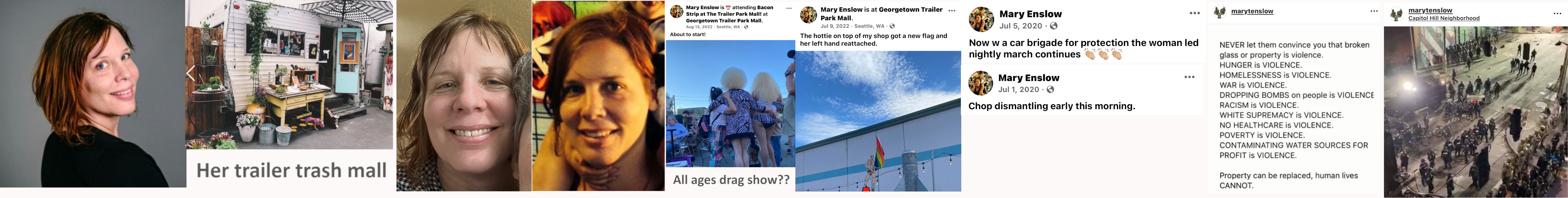 Mary Therese Enslow (Born Nov. '78) is a sculptor who created a sculpture for the occupied CHAZ zone in 2020. Enslow admitted in an interview to having rioted throughout the week. She referred to CHAZ, an anarchic zone where two black youth were murdered, as "so peaceful". Even though she's a sculptor, she seems to make her $$ as a tech support analyst. She also owns the Georgetown Trailer Park Mall which appears to be some sort of trashy pop-up arts and craft mall. She has a BFA from UW and her father was some sort of football star for the university in the 1960s. She lives in Seattle. https://archive.ph/wcxhv#selection-2323.0-2323.11 https://www.linkedin.com/in/mary-enslow-b55914241 http://georgetowntrailerparkmall.com/ (trailer park)