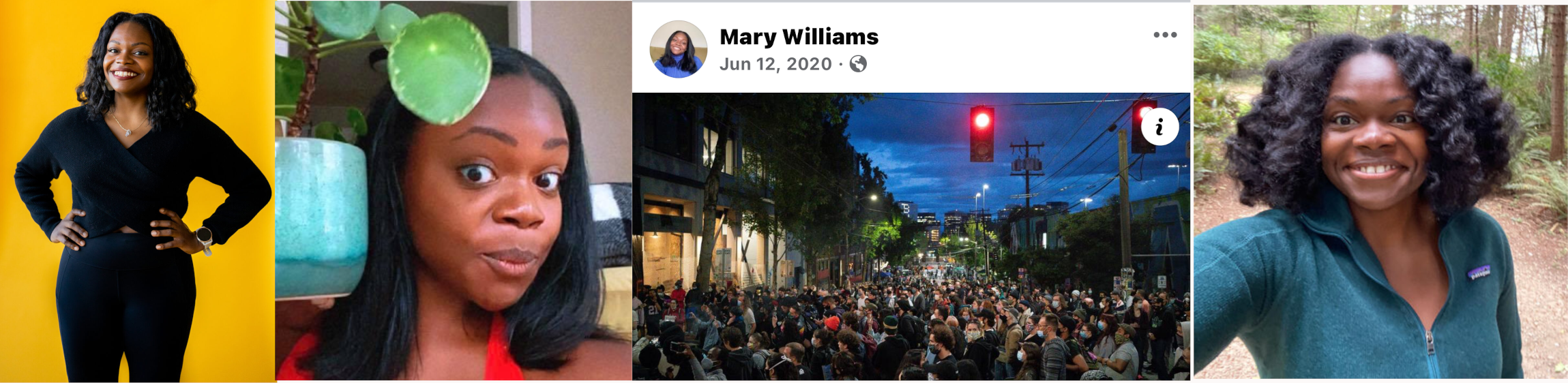 Mary Hall Williams co-hosted a Juneteenth event at Seattle's CHAZ/CHOP autonomous zone in June 2020. According to her bio, "Mary has spent her life working at the the intersections of community based partnership models and education as a youth leader, preschool teacher, on sustainability and gardening efforts, in unhoused outreach, and as an advocate for domestic workers rights." Williams studied anthropology at UW. She works for Young Women Empowered. https://archive.ph/MQ9xy#selection-1891.67-1891.86 https://archive.ph/Hz77U https://www.linkedin.com/in/4231b5236