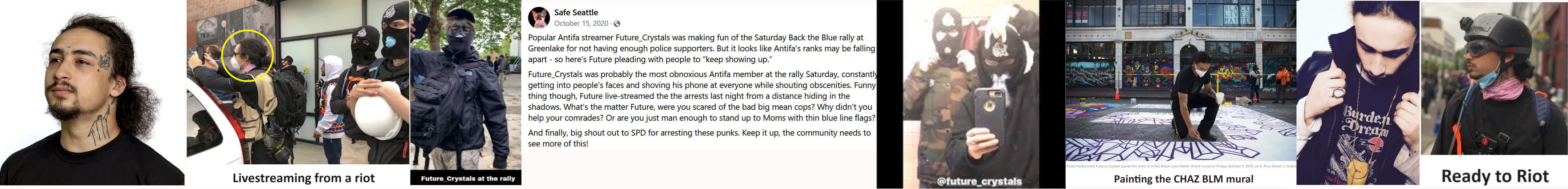 Chai Marsalis Adera, aka “Future Crystals” (Born Nov. ’95) is a Seattle artist who was heavily involved in George Floyd era riots in Seattle. Adera live-streamed from the riots using Twitch. He later claimed to have created a GoFundMe with his mother that raised $60K for rioting supplies. He claims to have used the money to buy medical supplies, protective riot gear and other things for rioters. Some of the money went toward bailing out rioters. Adera is the son of prominent Seattle left-wing activist Tracy Rector (https://antifawatch.net/ViewReport/08f4ffd3). He allegedly has used the alias "Bruce Calvert" at times. https://archive.ph/T4ALC https://archive.ph/L8J4X#selection-3523.3-3523.18