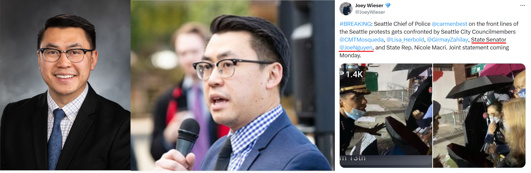 Joseph "Joe" Thanh Nguyen (DOB: 09/27/83) is a Democratic state senator who was spotted on the front line of a June 2020 riot in Seattle. He's been described as the AOC of the Washington state senate. Nguyen said his favorite part of his job is yelling "no" at Republicans. When he's not rioting, he takes his daughter to "volunteer" at a homeless camp. Nguyen works as a senior program manager for Microsoft and lives with his wife and kids in West Seattle. https://archive.ph/C0VLg, https://archive.ph/pKFIW https://en.wikipedia.org/wiki/Joe_Nguyen