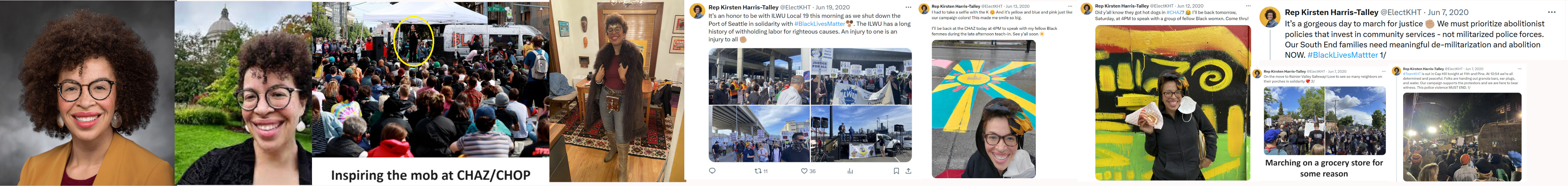 She's a former Washington state representative who gave a fiery speech to a mob at CHAZ/CHOP in 2020. She also posted numerous photos from CHAZ on her Twitter feed. She participated in an illegal shutdown of the Port of Seattle in June 2020, a time when America desperately needed crucial supplies to make it through the Chinese Coronavirus pandemic. She decided not to seek re-election as a state rep. because police abolition wasn't happening quickly enough. Despite the fact that she claims to be all in for Black Lives, she's married to a white dude. She lives in Seattle. https://archive.ph/lErcQ, https://archive.ph/pXy3f