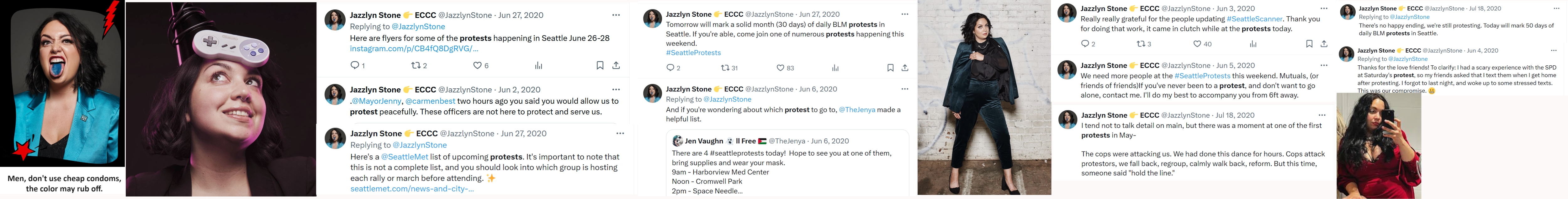 Stone participated in numerous Seattle riots in 2020 and used Twitter to encourage others to join in the fun. There's no evidence she was arrested at the riots. She works as a marketing consultant. For some reason, she was on a panel at the 2020 ComicCon although she doesn't appear to have authored any books. Her first name is probably a nickname. We're not sure what her real name is, possibly Jacqueline? https://archive.ph/2TtmC#selection-881.35-881.48 https://www.jazzlynstone.com/ https://www.linkedin.com/in/jazzlyn-stone