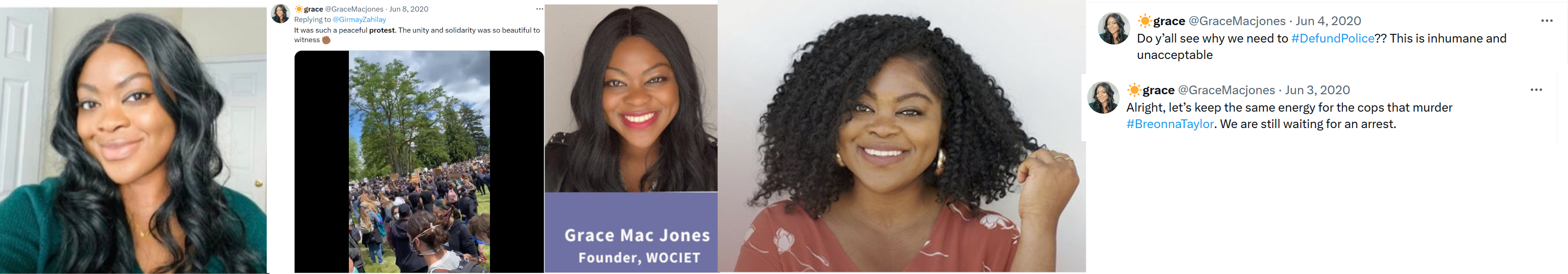 She Tweeted a vid from what appears to be Cal Anderson Park in Seattle the day the CHAZ/CHOP zone was established. She referred to the mob action as a "peaceful protest" even though things turned very violent a few hours later. In an earlier Tweet she had criticized vacationers ignoring COVID space suggestions yet she attended a super-spreader riot in Seattle. She's a software engineer at Microsoft, possibly a DEI hire. Her last known address was in Bellevue. See pics for backup. https://linktr.ee/gracemacjones https://www.linkedin.com/in/gracemacjones