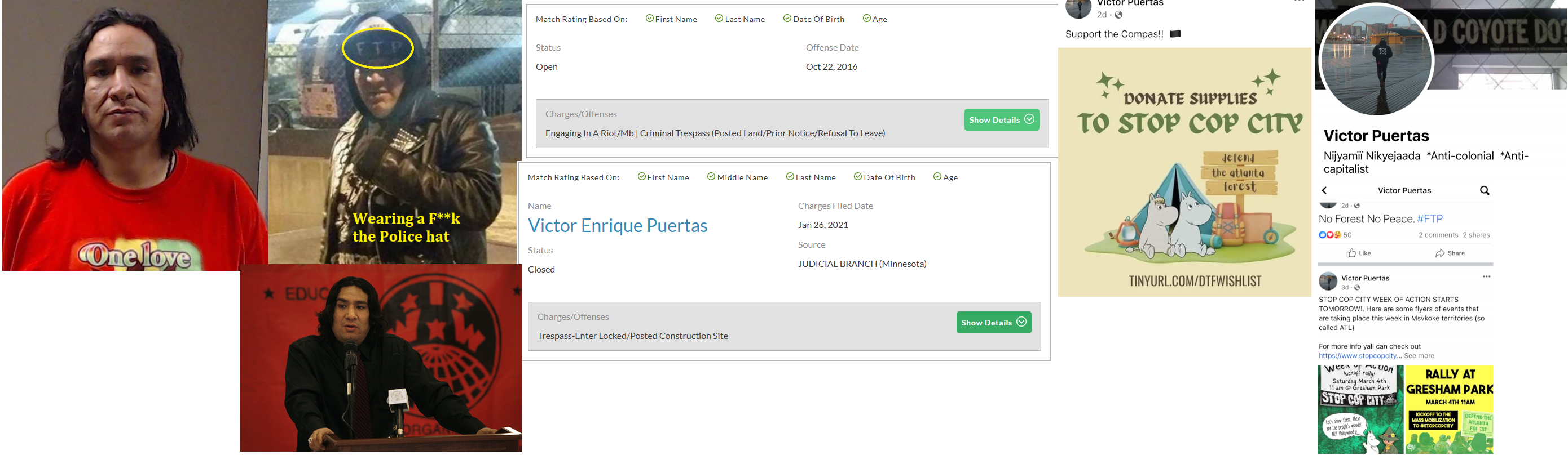 Victor Enrique Puertas claims to be an indigenous land protector. He appears to have been arrested at the Dakota Access pipeline protests in North Dakota in 2016 when he was charged with criminal trespassing and rioting. He was arrested at a 2021 protest in Minnesota of an Enbridge pipeline and charged with trespassing and unlawful assembly. He was later arrested at a March 2023 riot at the Cop City complex in Atlanta where the rioters shot explosives at police and burned construction equipment. Puertas may have been the rioter seen being tased on-camera by police. All Antifa arrested at that riot were held on domestic terrorism charges and possibly other charges as well. He lived in a surprisingly well-maintained house in Provo prior to his 2023 arrest. https://archive.ph/lwfx8 https://archive.is/uNAh5 https://archive.ph/PhS9w