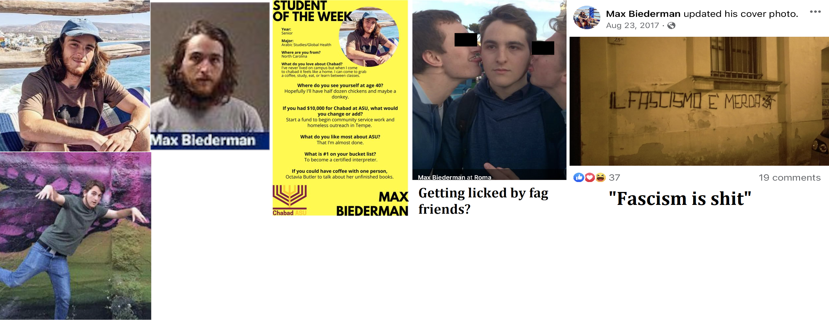 Max Jacob Biederman is a student at Arizona State University who traveled to Atlanta to participate in the Cop City protests. He was arrested at a March 2023 riot and charged with domestic terrorism. He was the ASU chapter of Chabad's student of the week in October 2022. Despite the fact he's Jewish, he's majoring in Arabic studies. His last known address was in Scottsdale. https://archive.ph/PhS9w https://archive.ph/06kau