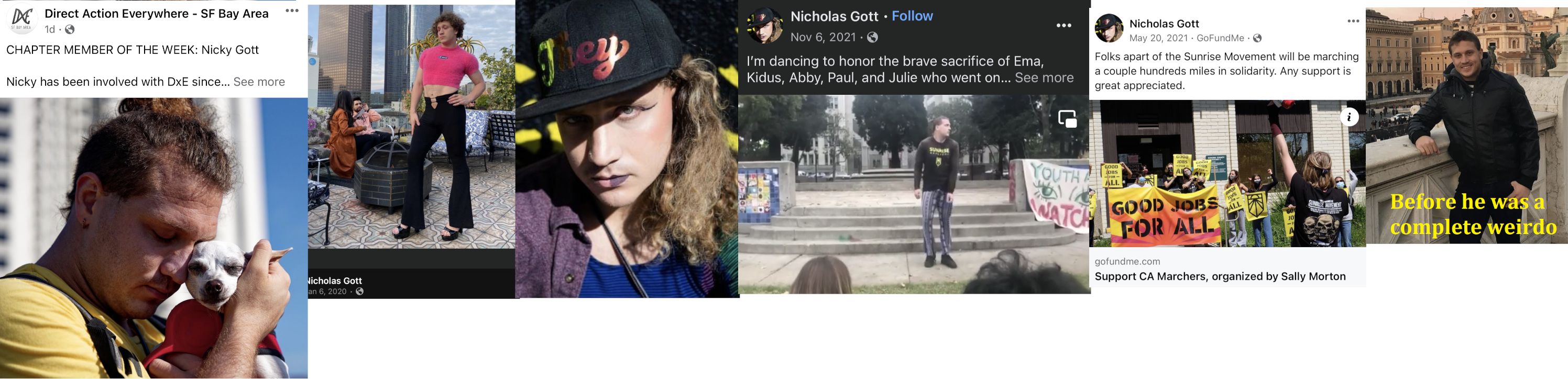 Nicholas "Nicky" David Gott is a member of the radical animal rights group Direct Action Everywhere (DxE). He was the San Francisco chapter's member of the week in mid-February 2023. Gott is also involved with the radical environmentalist Sunrise Group. Gott has a software engineering degree from prestigious Harvey Mudd College. He's probably a tranny as he's been photographed in drag. His last known address is in Oakland, but he claims on his Facebook profile to live in L.A. https://web.archive.org/web/2/https://popularresistance.org/climate-activists-occupy-wells-fargo-global-headquarters/
