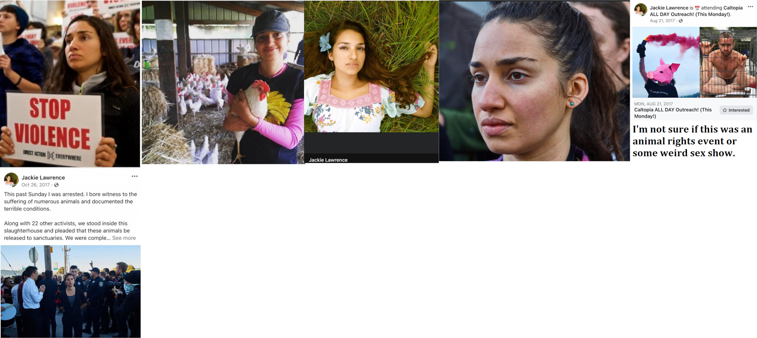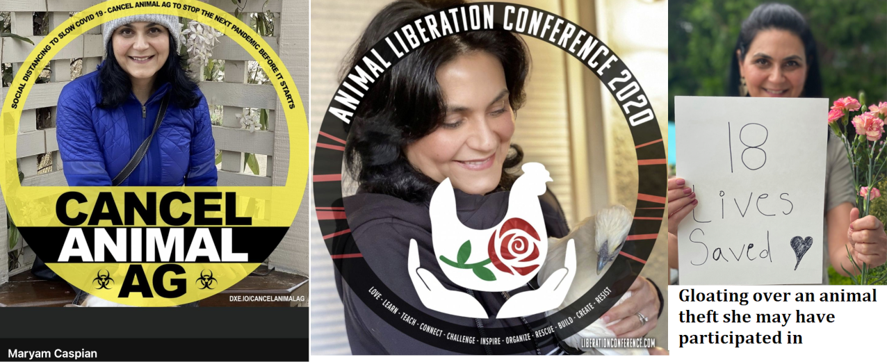 She's an organizer for the radical animal rights group Direct Action Everywhere (DxE). Caspian likes to re-post a lot of info about animal thefts and other actions by DxE but it's unclear if she actually participated herself. She's of Iranian descent and lives in the SF Bay Area, possibly in San Mateo. She probably works in the tech industry as she's a member of the Persian Women in Tech group.