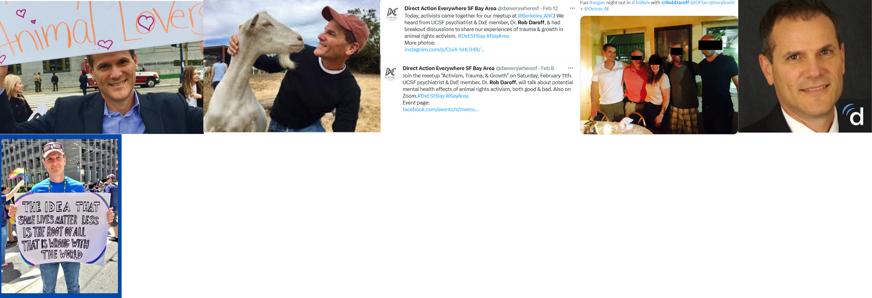 Dr. Robert "Rob" Barry Daroff is a clinical psychiatrist and a member of the radical animal rights group Direct Action Everywhere (DxE). No doubt many of DxE's members avail themselves of the doctor's services. He was or still is an Army reservist. He works for the VA medical center in San Francisco and is a professor at UCSF. He lives in a weird looking black house in the Claremont neighborhood of Oakland. https://archive.ph/O5lsN https://archive.ph/ADY1X https://archive.ph/FoFic https://www.linkedin.com/in/rob-daroff-663a31