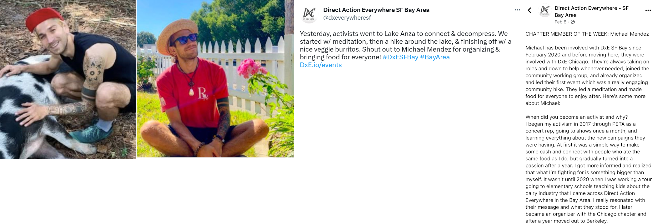Mendez is a member of the SF Bay Area chapter of the radical animal rights group Direct Action Everywhere (DxE). He's also a current or former PETA member. Mendez was a DxE organizer in Chicago before he moved to the Bay Area. He was the SF Bay Area chapter's member of the week in early February 2023. He lives an eco-friendly, minimalist lifestyle somewhere in the Bay Area. See images for backup.