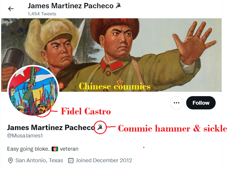 James Martinez Pacheco (DOB: 05/16/82) self-identifies as a commie in his Twitter profile. He claims to be a veteran and may work as an oil field technician. He lives in a decent house in south San Antonio.