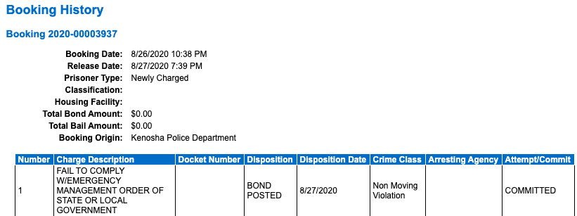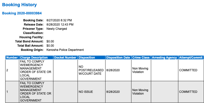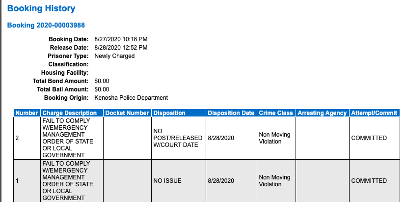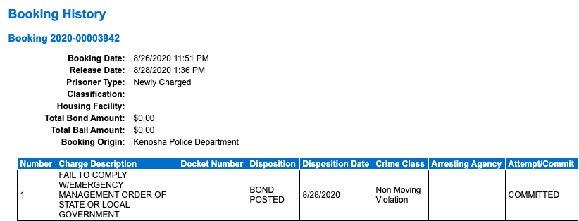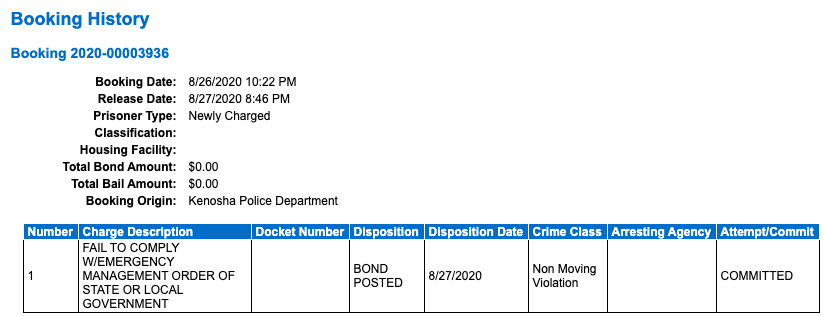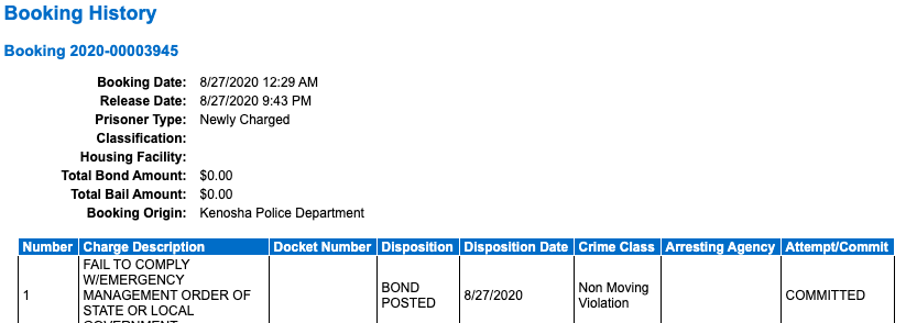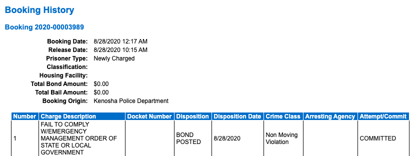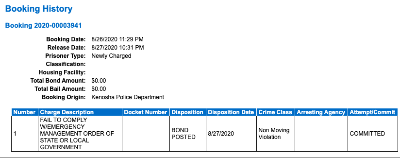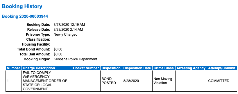 http://inmate.kenoshajs.org/NewWorld.InmateInquiry/kenosha/Inmate/Detail/-16203 FAIL TO COMPLY W/EMERGENCY MANAGEMENT ORDER OF STATE OR LOCAL GOVERNMENT