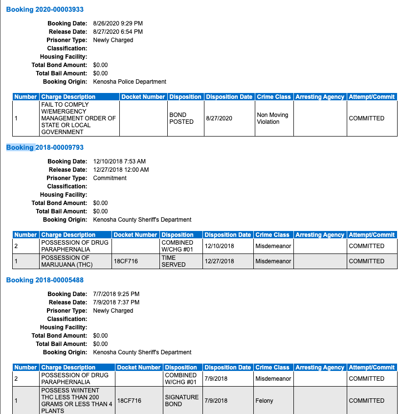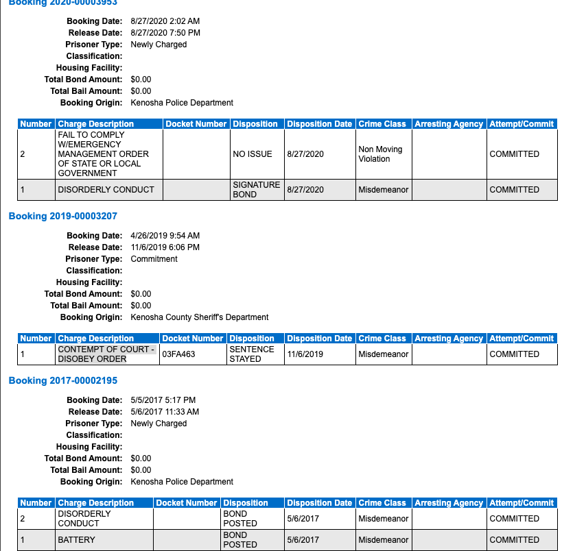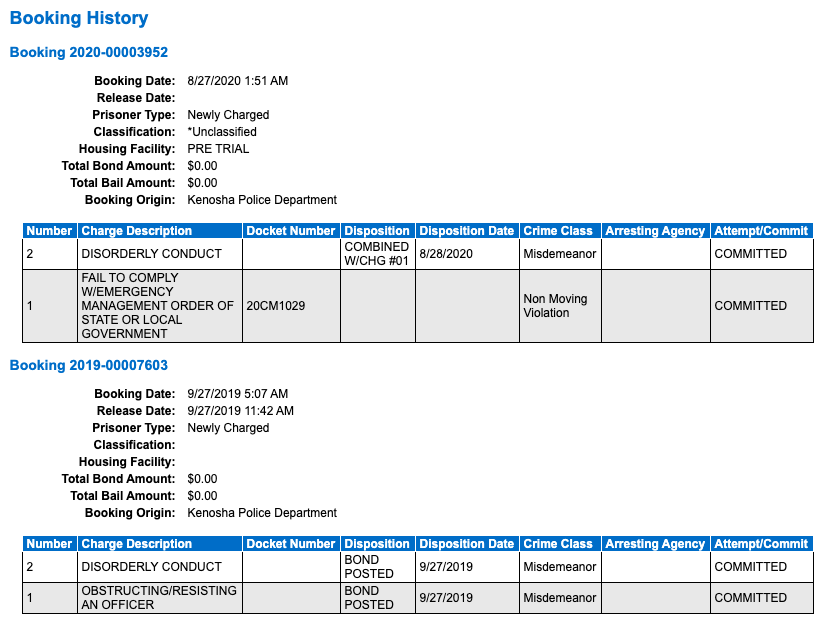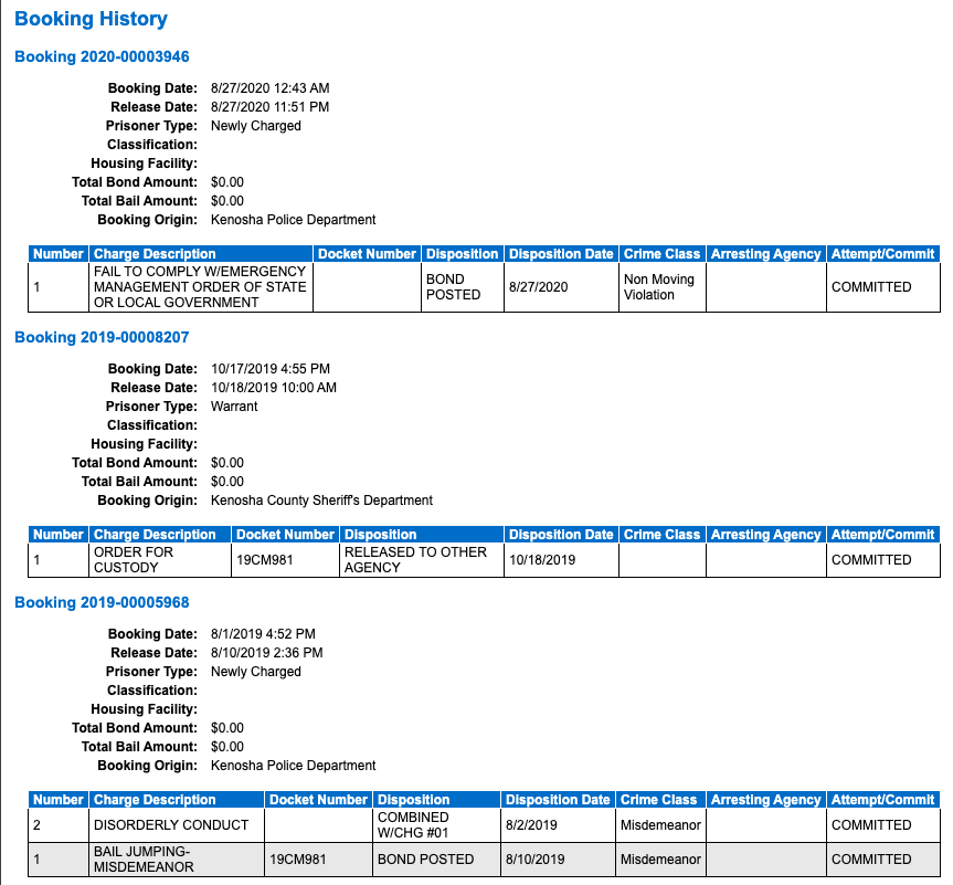 http://inmate.kenoshajs.org/NewWorld.InmateInquiry/kenosha/Inmate/Detail/-551211 FAIL TO COMPLY W/EMERGENCY MANAGEMENT ORDER OF STATE OR LOCAL GOVERNMENT DISORDERLY CONDUCT OBSTRUCTING/RESISTING AN OFFICER
