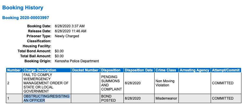 http://inmate.kenoshajs.org/NewWorld.InmateInquiry/kenosha/Inmate/Detail/-597925 FAIL TO COMPLY W/EMERGENCY MANAGEMENT ORDER OF STATE OR LOCAL GOVERNMENT OBSTRUCTING/RESISTING AN OFFICER