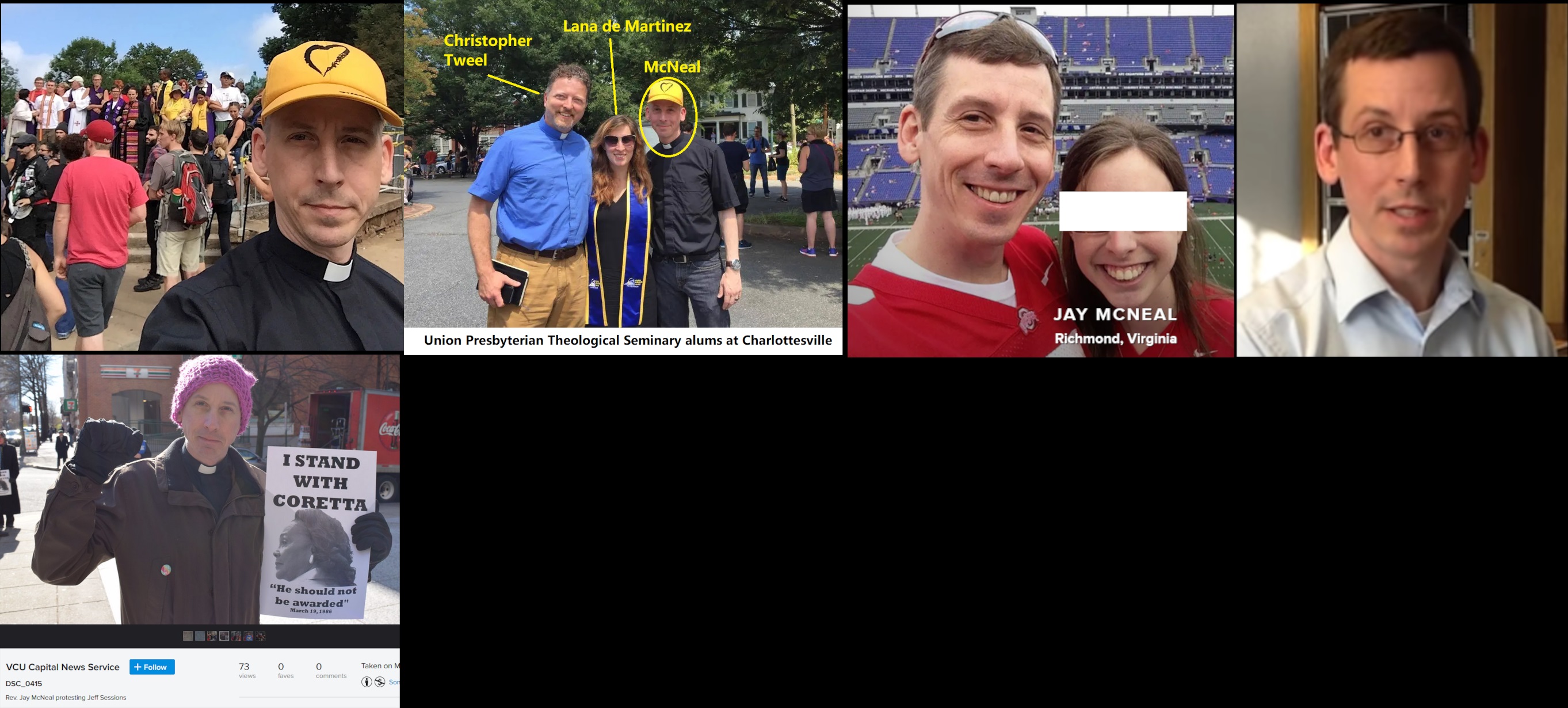 He's a minister who participated in the Charlottesville Unite the Right counter-protest. McNeal wrote in an article about his experience at the riot and said, "We must stand with immigrants and refugees. We must stand with Latinx and Asians. We must stand with the the LGBTQIA communities. We must stand with Black Lives Matter." He's the founder of United Faith Leaders. He was in the Army and left to enter the seminary. He's been affiliated with the Baptists and Presbyterians. McNeal attended Union College in New York and Union Presbyterian Theological Seminary in Virginia. He's currently (2022) believed to live in the Columbus, Ohio area. https://archive.vn/8iFKS https://www.linkedin.com/in/jaymcneal