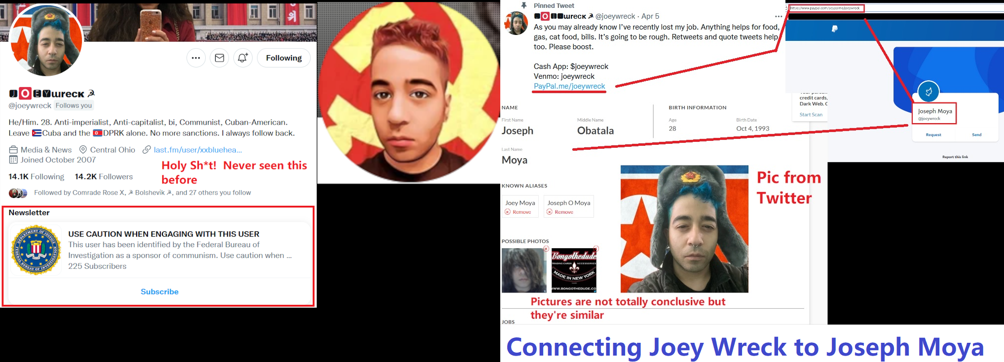 Joseph Obatala Moya, AKA Joey Wreck, AKA Joey Moya (DOB:10/04/93) is most likely the man behind the extreme leftist Twitter persona Joey Wreck. Wreck's Twitter links to a PayPal account owned by Joey Moya. His Twitter feed is so left-wing, it briefly had a visible FBI warning in early 2022. It's possible the FBI considered him a foreign agent for China or Venezuela. Moya is so left-wing that he makes infamous Antifa members such as Molly Conger look like patriots by comparison. His Twitter feed is full of garbage critical of the USA and complementary of Cuba, China, Venezeula, etc. Other than his extremely active Twitter account, there's not much about him online. Moya claims to have recently (2022) lost his job although it's unclear exactly what he did when employed. He lives with his extended family in a home owned by his mother near Gahanna, Ohio east of Columbus. Moya has a twin brother who isn't known to be radicalized. https://archive.ph/cPV6O