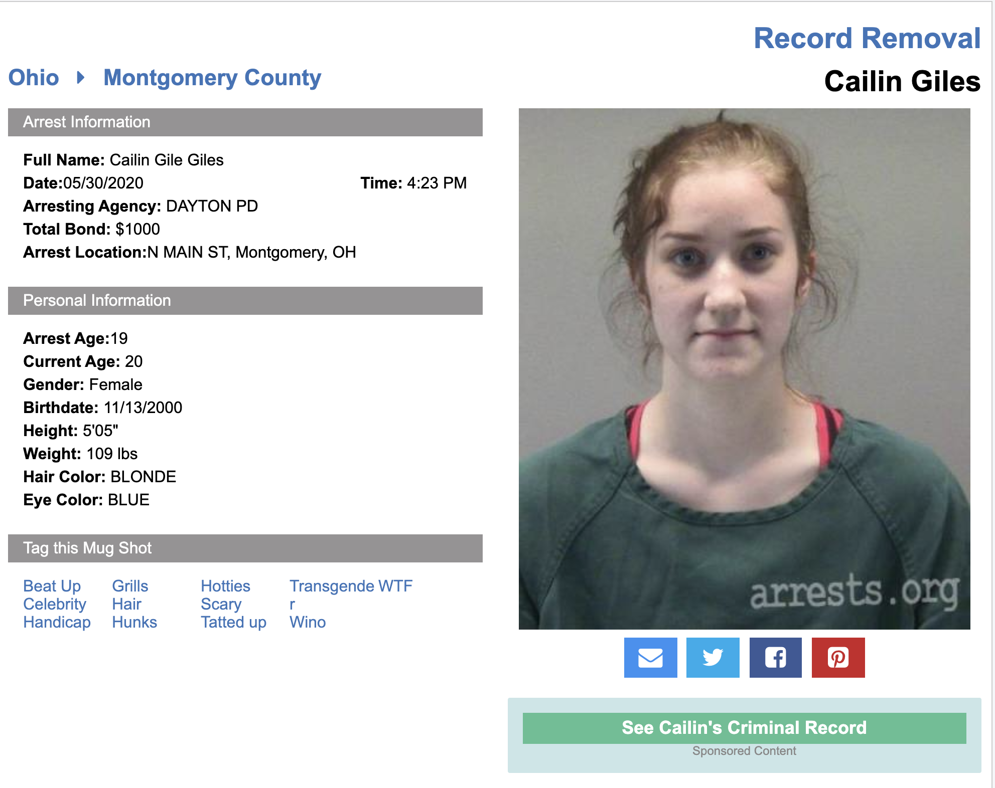 Arrested for attending riot in Dayton, OH on 5/30/2020 https://twitter.com/taylorcharlene_/status/1266480081310035968 https://archive.ph/wip/TOsjY