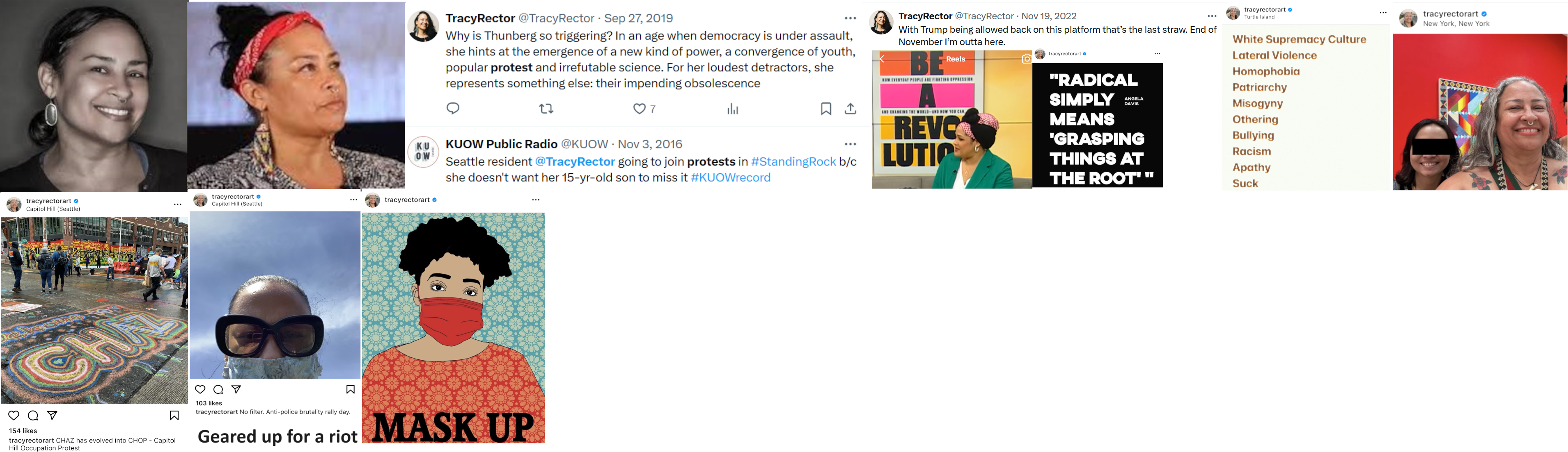 Tracy Renee Rector (Born May '72) is a Seattle filmmaker who staffed a handwashing station at Capitol Hill protests in Seattle in June 2020. She previously protested at Standing Rock with her 15 year old son in North Dakota in 2016. Rector has supposedly made over 200 films but that number must include the cat vids on her iPhone. She describes herself as a multicultural brown femme and intersectional environmentalist. Rector is another radical alum of Evergreen State University and earned a BA in native American studies. Her last known address was in Tacoma. Mastodon: @tracyrector https://archive.ph/wozOX#selection-999.188-999.200 https://en.wikipedia.org/wiki/Tracy_Rector https://archive.ph/4LCt1