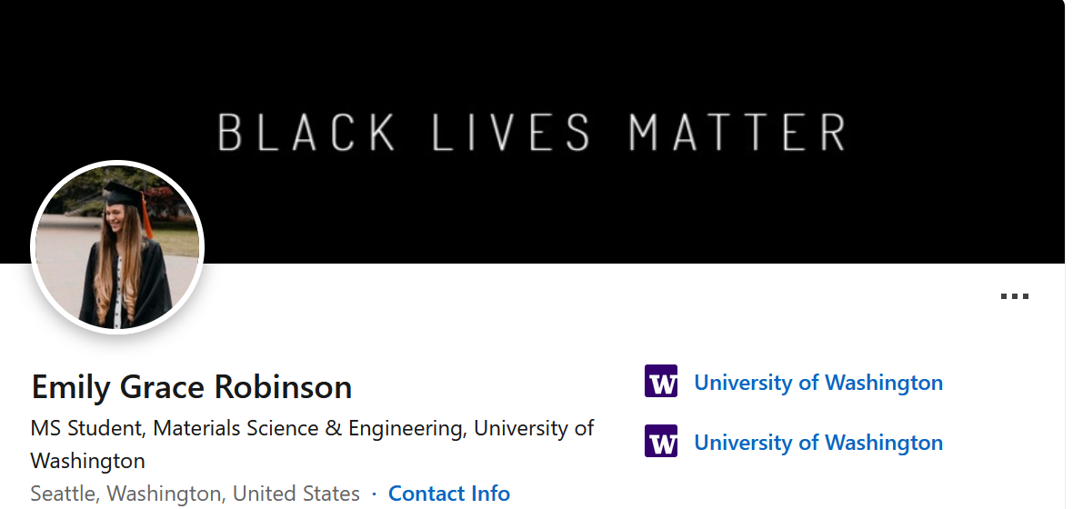 Emily Grace Robinson (Born May '92) claimed in an affidavit to have participated in over 100 protests / riots since May 2020 and she took her five year old son to half of them. She didn't take her son to night protests because they were past his bedtime. She brought the kid to the 2020 Labor Day riot and then panicked when police began using tear gas and flash bang grenades to control the rioters. She had to jump in a vehicle that was part of the Car Brigade, a group of people who illegally block traffic during riots. Robinson complained because her kid's eyes hurt from tear gas. She has a materials engineering degree from U Wash and was studying for a masters degree as of 2024. https://web.archive.org/web/20240228213043/https://storage.courtlistener.com/recap/gov.uscourts.wawd.286633/gov.uscourts.wawd.286633.123.0.pdf https://www.linkedin.com/in/grob