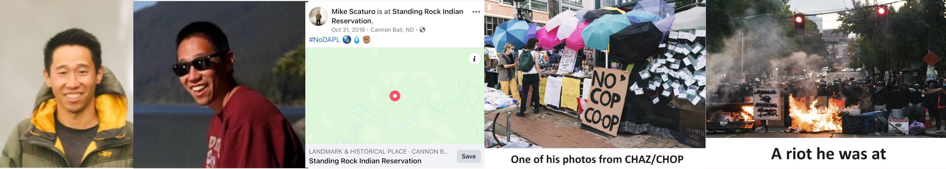 Michael "Mike" L. Scaturo (Born Nov. '91) styles himself as a freelance journalist who documents Seattle police. Scaturo admitted in an affidavit to having actively participating outside his capacity as a journalist in several Seattle riots. He claims to have attended an August riot in honor of Summer Taylor as a journalist and complained because police were making snarky comments about rioters. Scaturo was also at the 2020 Labor Day riot, supposedly as a journalist. He was previously at the illegal Standing Rock protest in North Dakota and checked in on FB in 2016. Scaturo was at CHAZ/CHOP and took a lot of photos. His freelancing seems to be a side gig. He works as a digital marketing specialist for the Seattle Sounders soccer team. His last known address was in Seattle. https://web.archive.org/web/20240228175734/https://storage.courtlistener.com/recap/gov.uscourts.wawd.286633/gov.uscourts.wawd.286633.118.0.pdf https://www.mikescaturo.com/ https://www.linkedin.com/in/mikescaturo