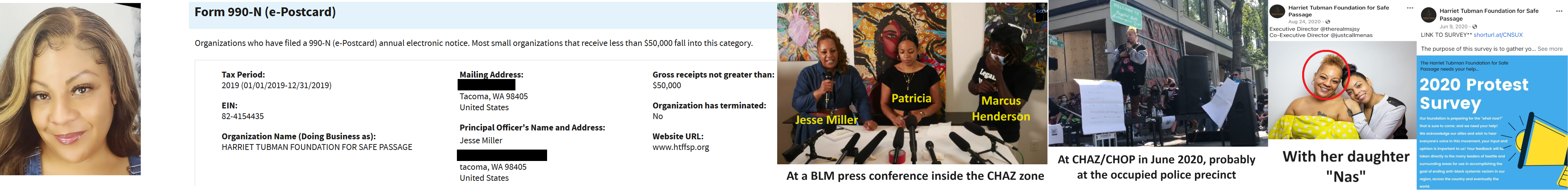 She's a radical BLM leader in the Seattle area. Her daughter Patricia (Naudia) is also a BLM leader. The older Miller founded and leads a non-profit known as the Harriet Tubman Foundation for Safe Passage which raked in over $1 mil. In donations in 2021. Miller was at CHAZ/CHOP and participated in a press conference from the occupation zone along with her daughter and Marcus Henderson (https://antifawatch.net/ViewReport/e8e75a4d) in June 2020. She was also seen giving a speech on the street in CHAZ. Miller uses the title "Dr." on her LinkedIn page although it's unclear where she earned this degree. It's probably a mail order or honorary diploma. She's from Tacoma's notorious Hilltop neighborhood which was once a stronghold of the Crips gang. She still lives in the Hilltop hood in a trashy house with several old RVs parked out front. https://twitter.com/i/status/1270863624135798785 https://www.youtube.com/watch?v=nylOpg6GyI8&ab_channel=ConvergeMedia https://harriettubmanfoundationforsafepassage.org/ https://www.linkedin.com/in/msjesse https://web.archive.org/web/20240301182245/https://apps.irs.gov/pub/epostcard/cor/824154435_202112_990_2023071021472710.pdf (Foundation tax return)