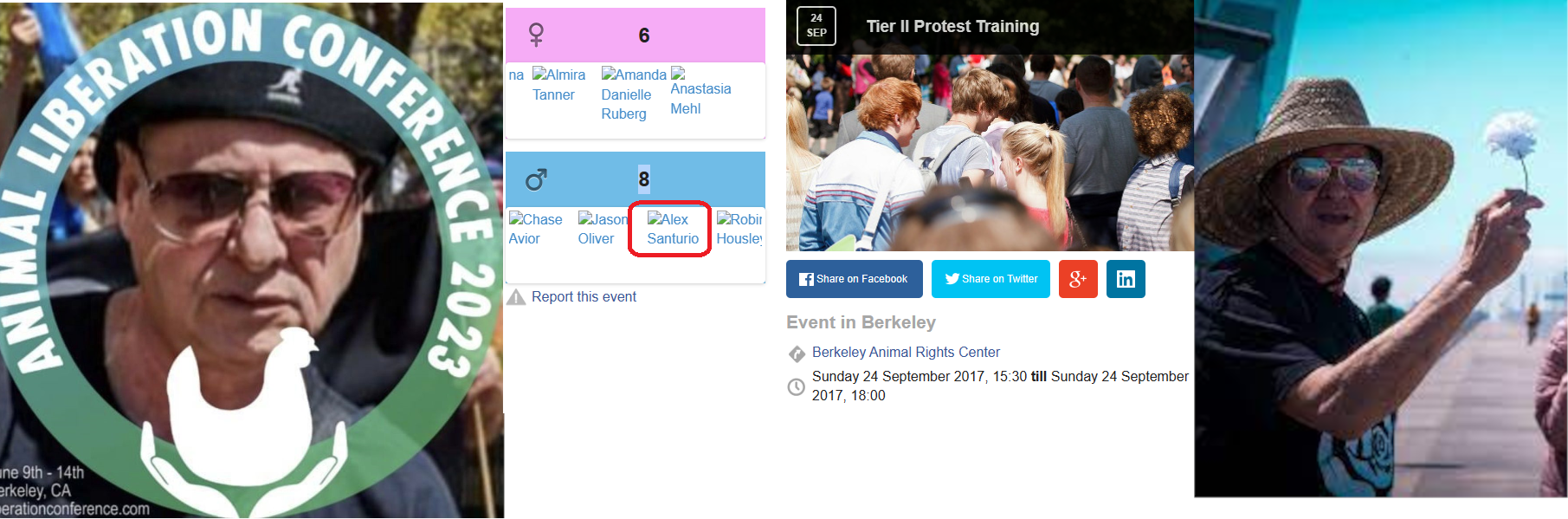 Hector Alex Santurio, aka Alex Santurio, is a Direct Action Everywhere (DxE) member who was arrested for stealing livestock from a Sonoma County farm in the late 2010s. He was prepared as he attended at least one "Level 2" protest training session sponsored by an animal rights group. Santurio runs a micro-sanctuary with his family. He's an artist who made some artwork commemorating dead racehorses. His daughter, Alicia Santurio (https://antifawatch.net/ViewReport/4acaaf40), is also active in DxE. He claims to be from Uruguay, but he's been in the States for decades. His Social Security number was issued in the '70s. Santurio's legal first name is Hector, but he goes by Alex everywhere. He lives in Fairfield in between San Francisco and Sacramento. https://web.archive.org/web/20221222064526/https://righttorescue.com/sunrise/